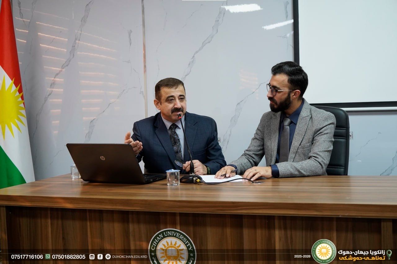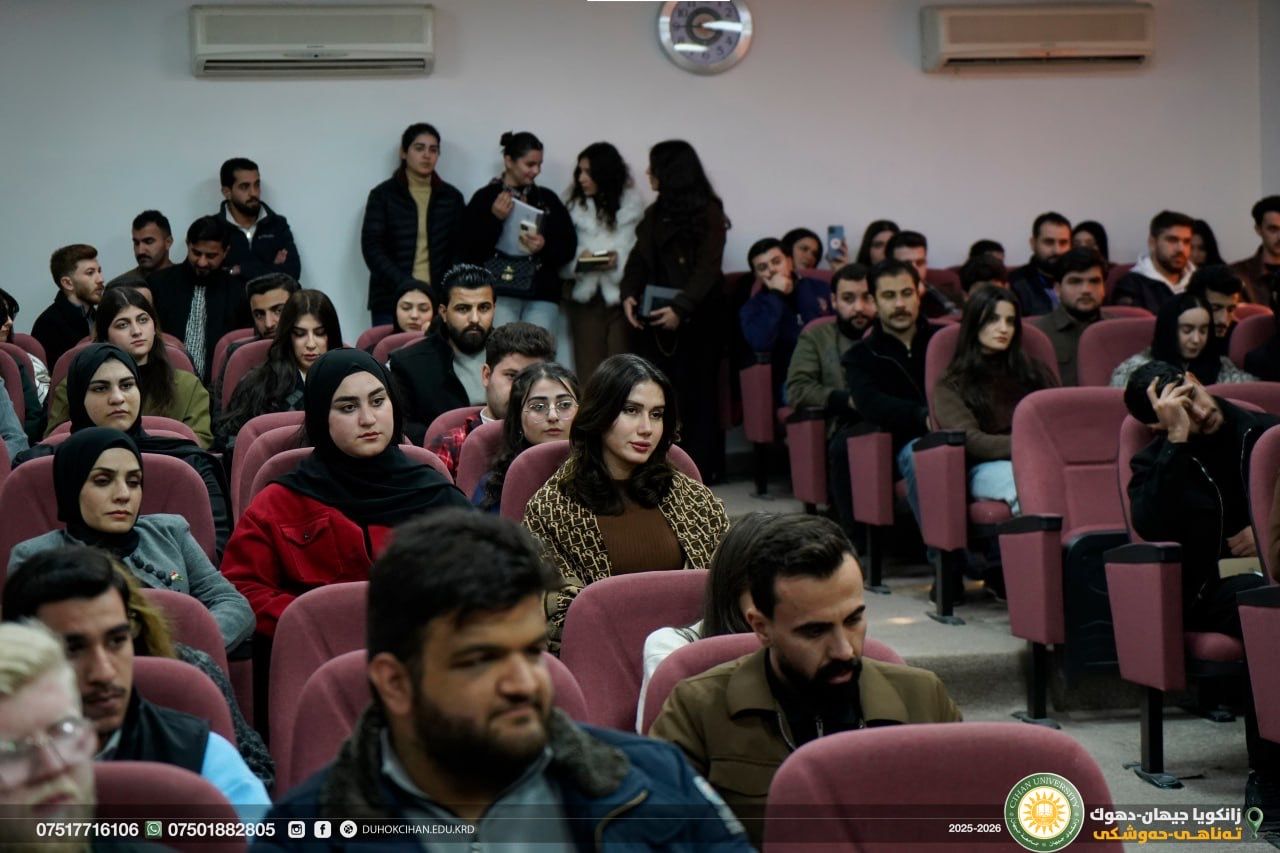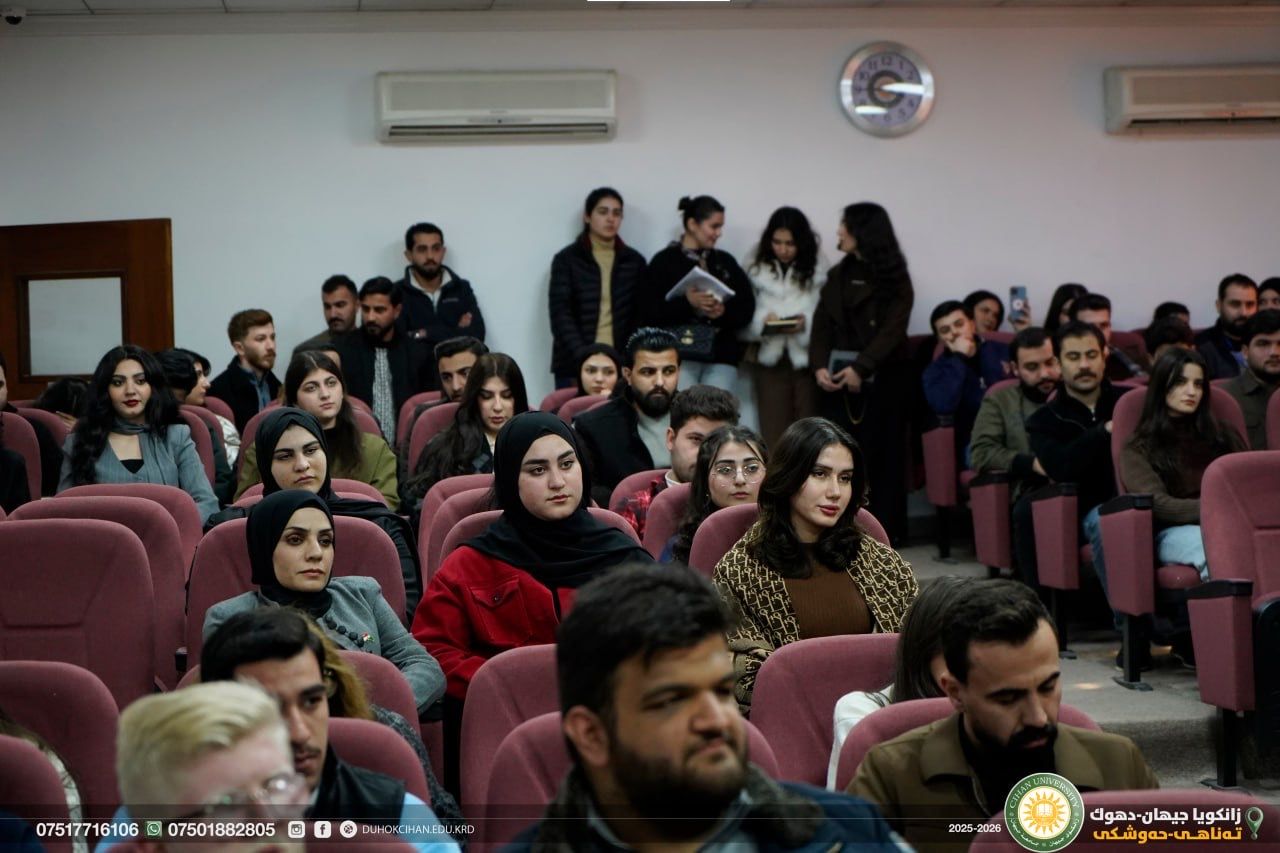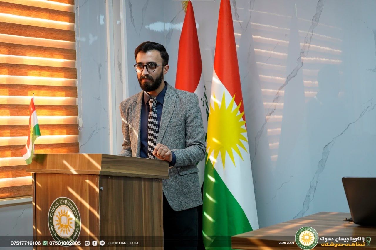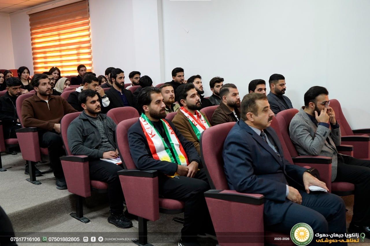 On January 27 (Tuesday), the Cihan Academy-Duhok, in cooperation with the College of Law at Cihan University–Duhok, organized a seminar dedicated to the writer "Sherzad Nayif", entitled “A Linguistic Reading of the Kurdistan Flag.” The seminar was held at Cihan University–Duhok, Peshmerga Hall. During the seminar, the lecturer presented an analytical discussion of several key linguistic concepts related to the topic. This was followed by an academic debate in which students and faculty members actively participated, engaging in a scholarly exchange of ideas.
