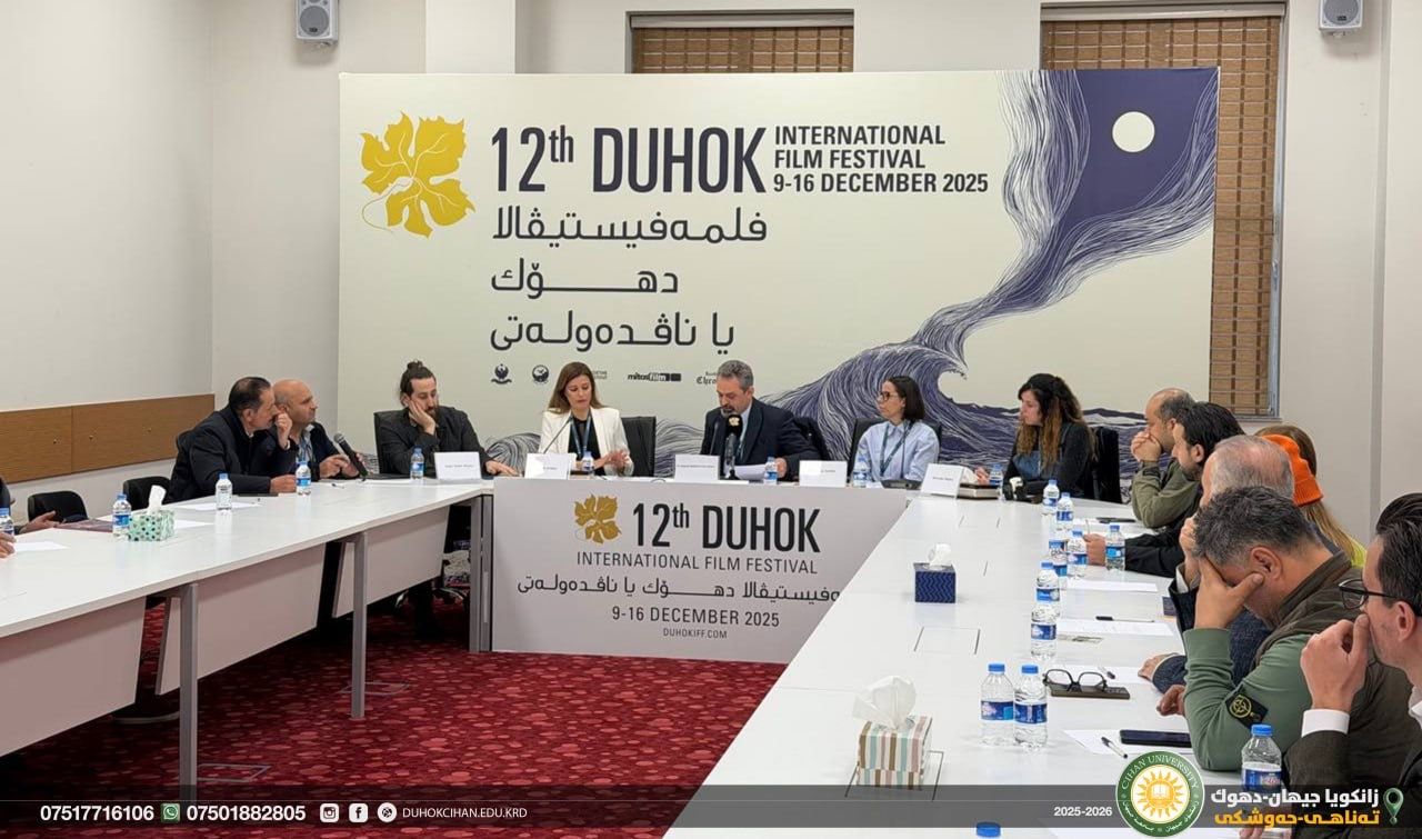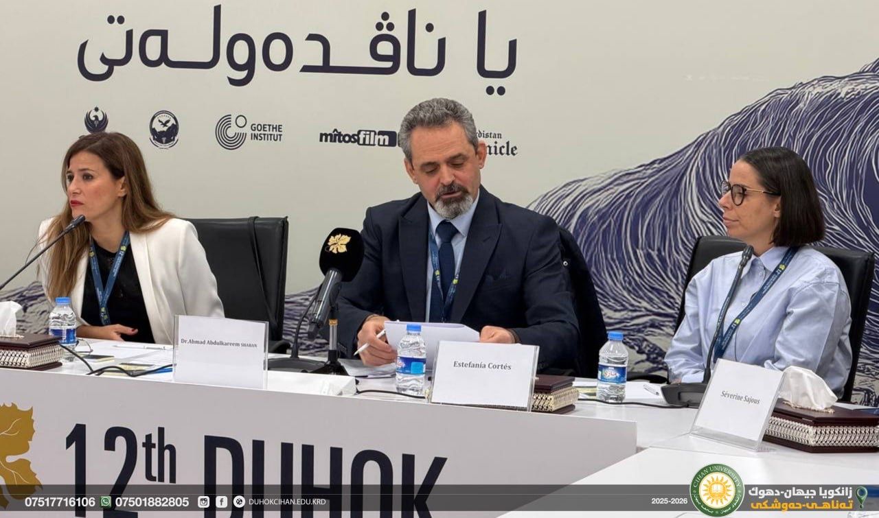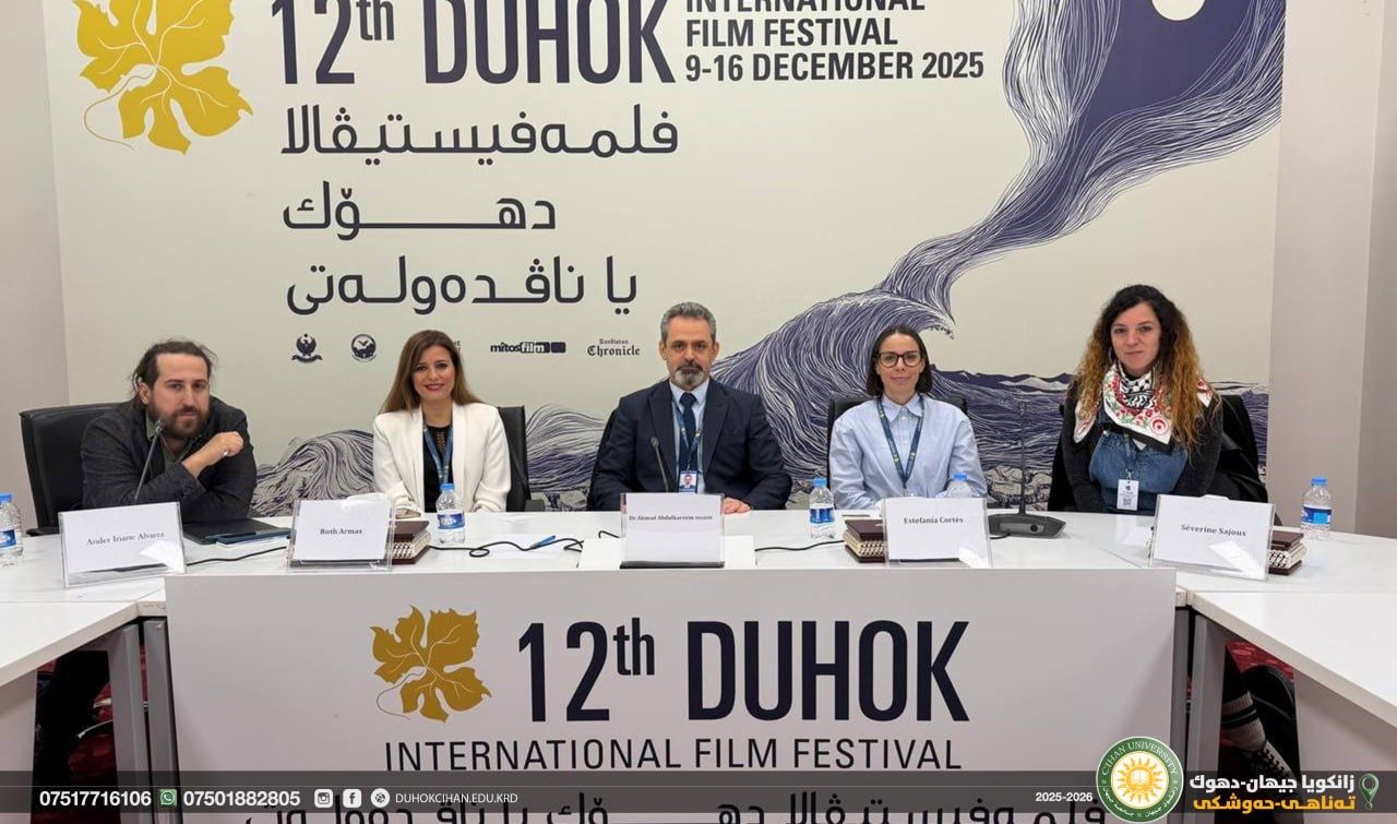 On Monday, December 15, under the directive of the highly respected President of the University and with the initiative of the Cihan University–Duhok Academy, Cihan University–Duhok participated in the 12th Duhok International Film Festival. The participation included( Dr. Ahmed Abdulkarim Shaaban), a professor in the Department of General Education, (Shiyan Mahdi Abdulrahman), the Academic Coordinator of Cihan University–Duhok, along with a group of faculty members and students. The event featured a special panel titled “Spanish Cinema: History and Challenges,” which was moderated with the participation of four Spanish filmmakers: Séverine Sajous, Ander Iriarte Alvarez, Ruth Armas, and Estefanía Cortés. It is worth mentioning that for several years, Cihan University–Duhok, through its professors, staff, and students, has played an active and influential role in the programs of the Duhok International Film Festival, continually striving to contribute to its development and advancement.