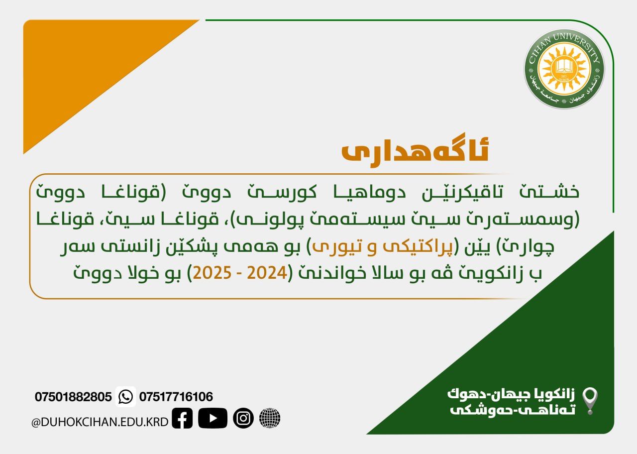 خشتێ تاقیکرنێن دوماهیا کورسێ دووێ (قوناغا دووێ (وسمستەرێ سیێ سیستەمێ پولونی)، قوناغا سیێ، قوناغا چوارێ) یێن (پراکتیکی و تیوری) بو هەمی پشکێن زانستی سەر ب زانکویێ ڤە بو سالا خواندنێ (2024 - 2025) بو خولا دووێ.