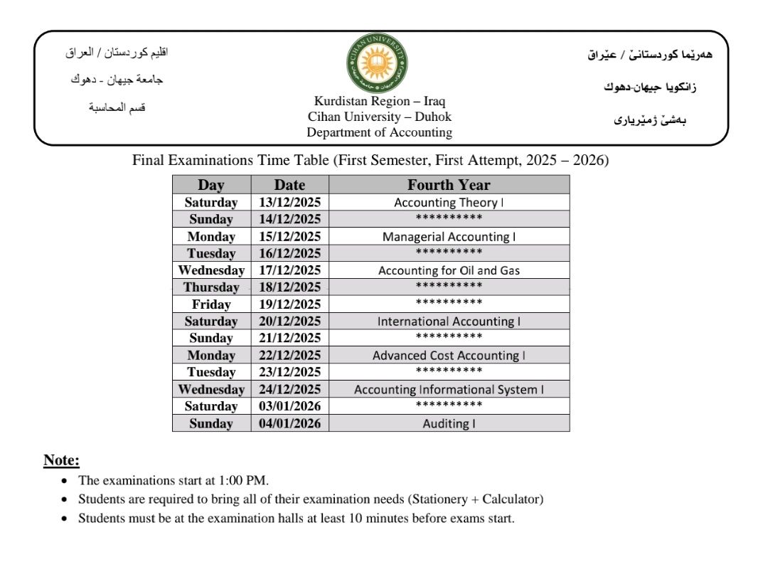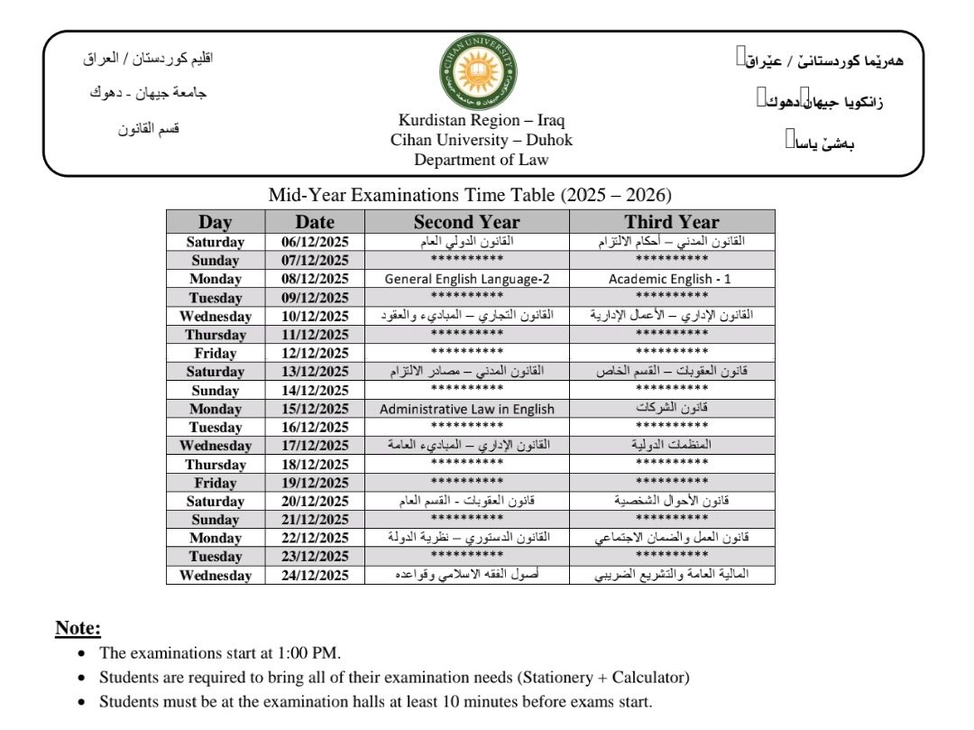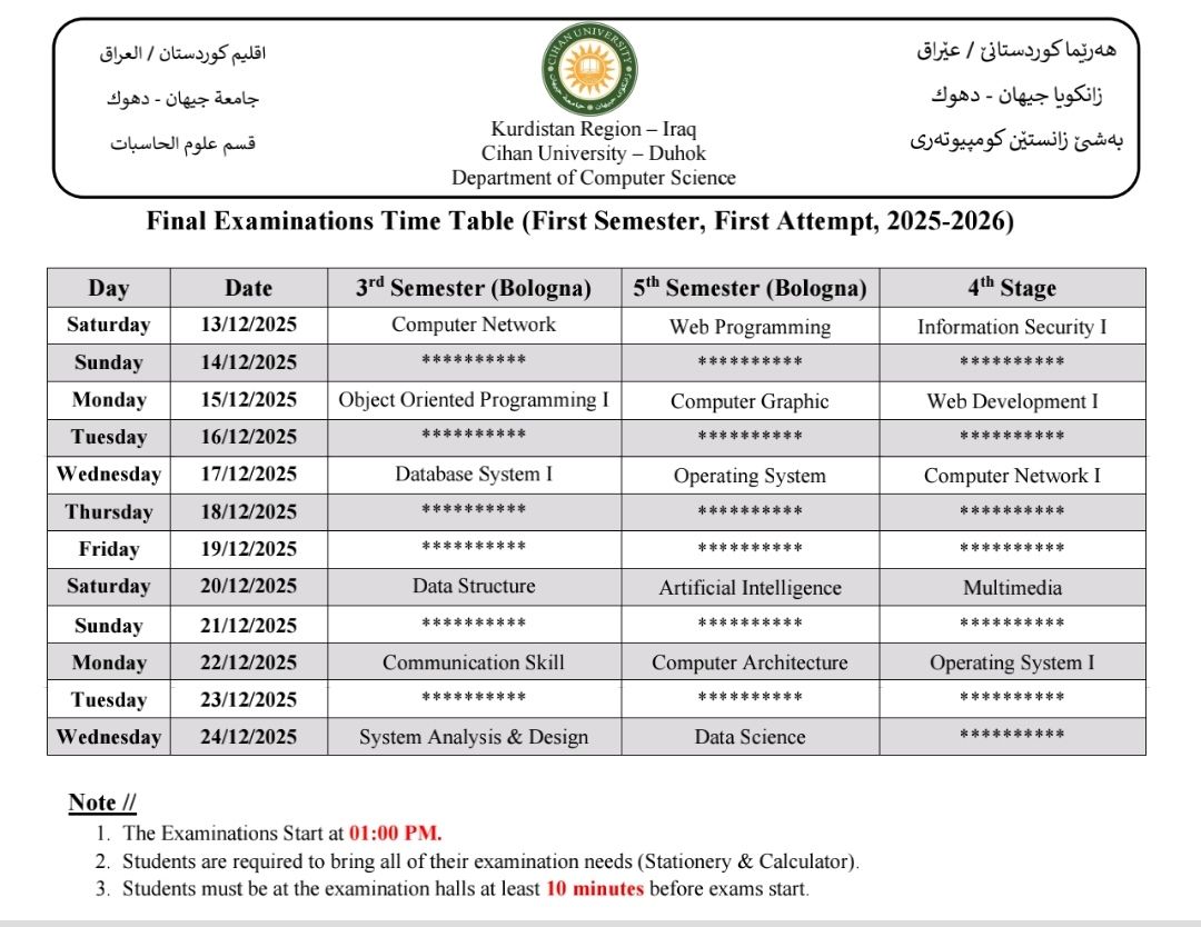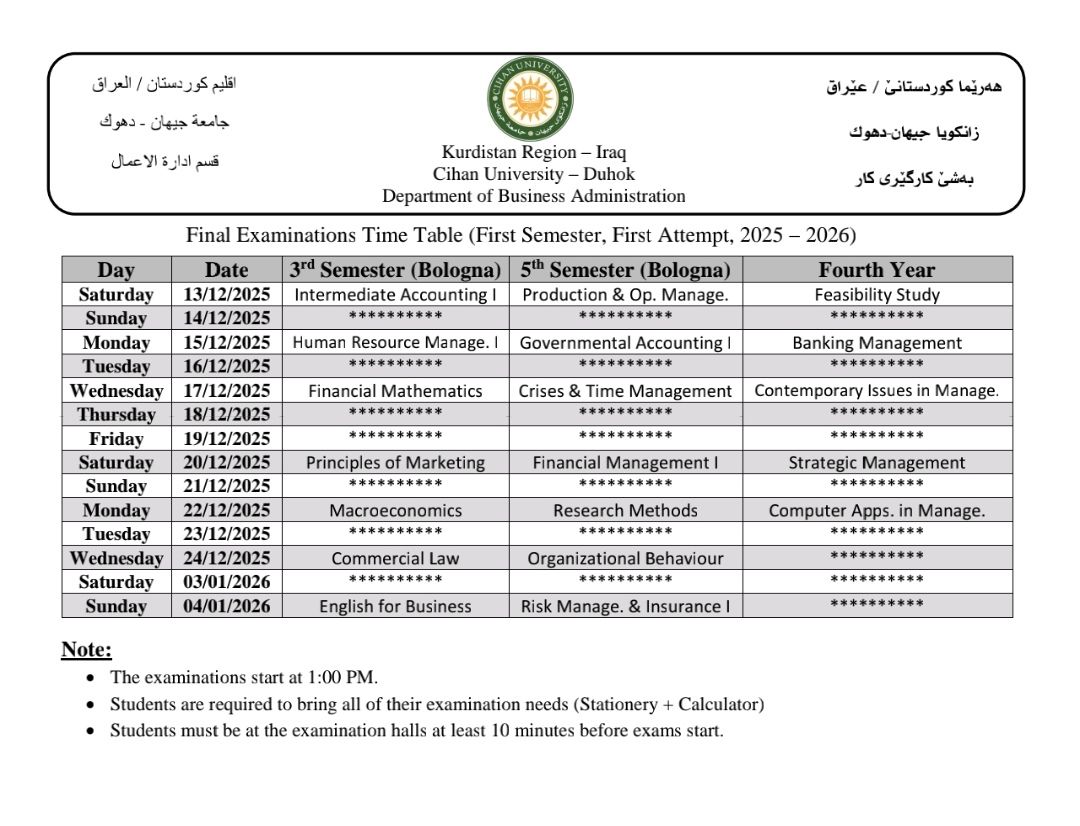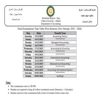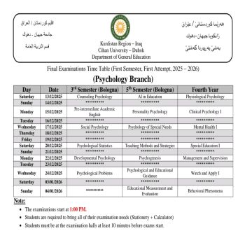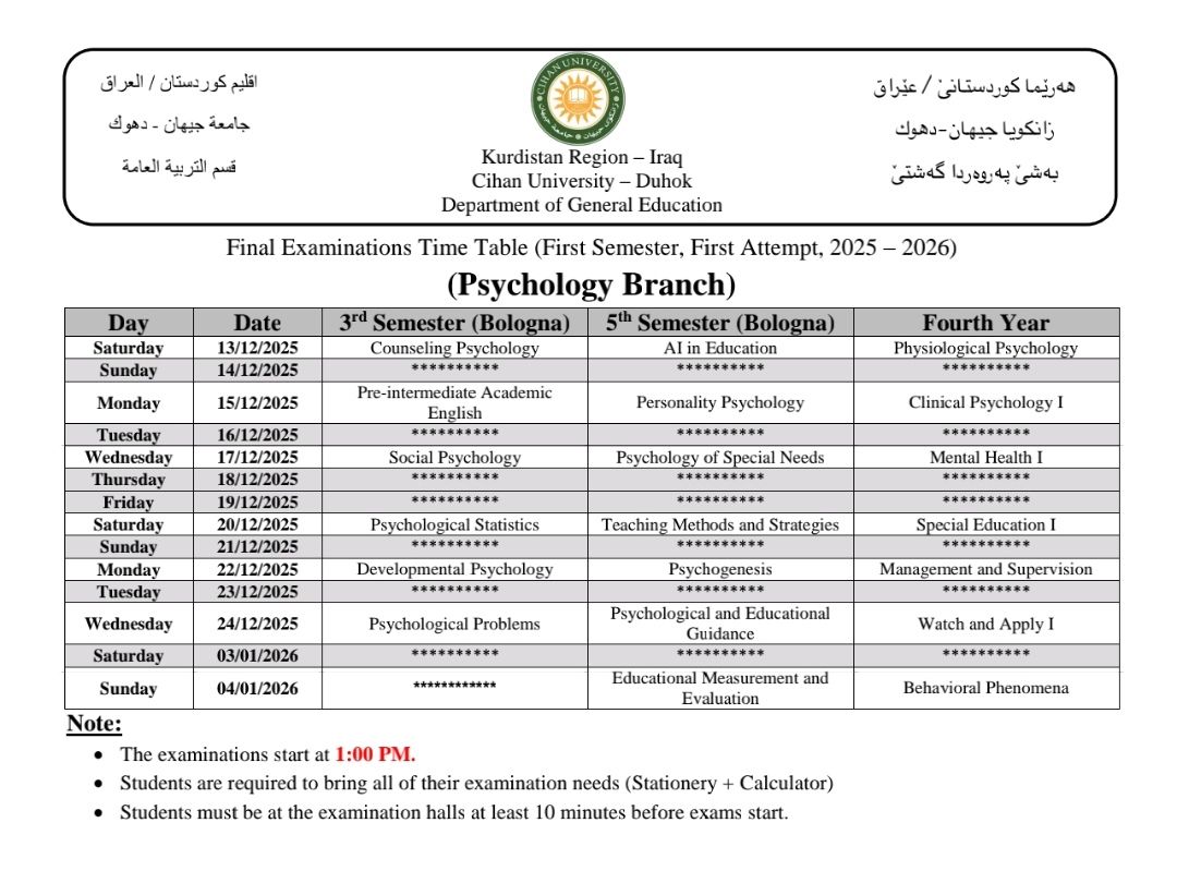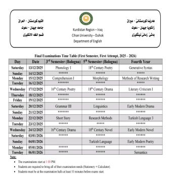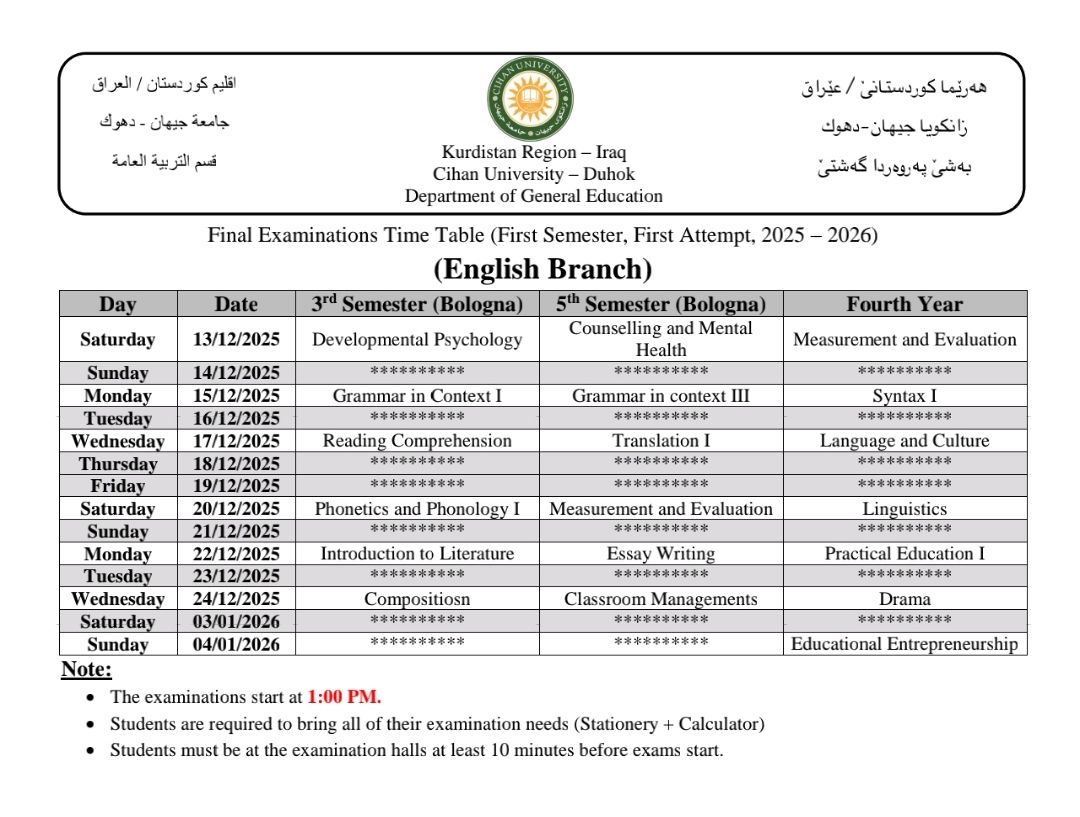 خشتێ تاقیکرنێن دوماهیا کورسێ ئێکێ یێن تیوری (نظري) بو قوناغێن دووێ (و سمستەرێ سیێ سیستەمێ پولونی)، سيێ (و سمستەرێ پێنجێ سیستەمێ پولونی) و چوارئ یێن پشکێن زانستی (ئینگلیزی، پەروەردا گشتی، زانستێن کومپیوتەری، کارگێری کار، و ژمێریاری) دگەل پشکا یاسا بو سالا خواندنێ (2025 - 2026)