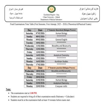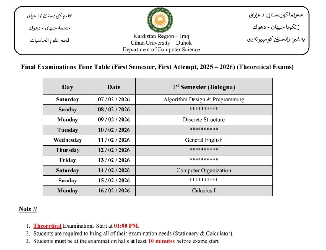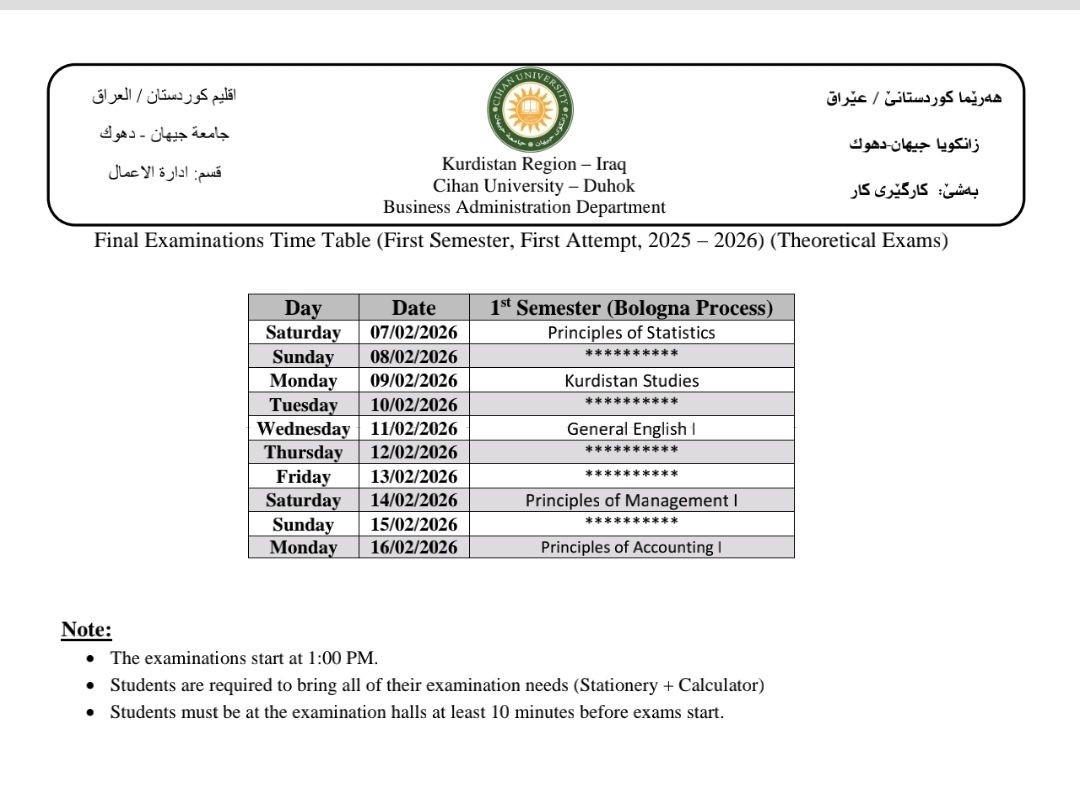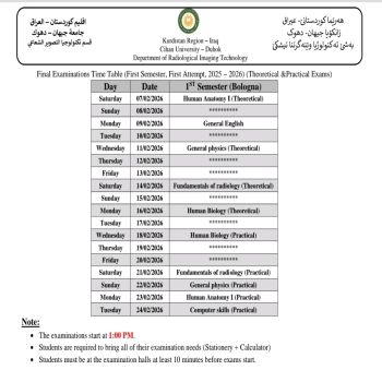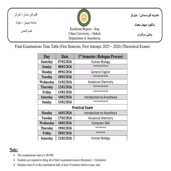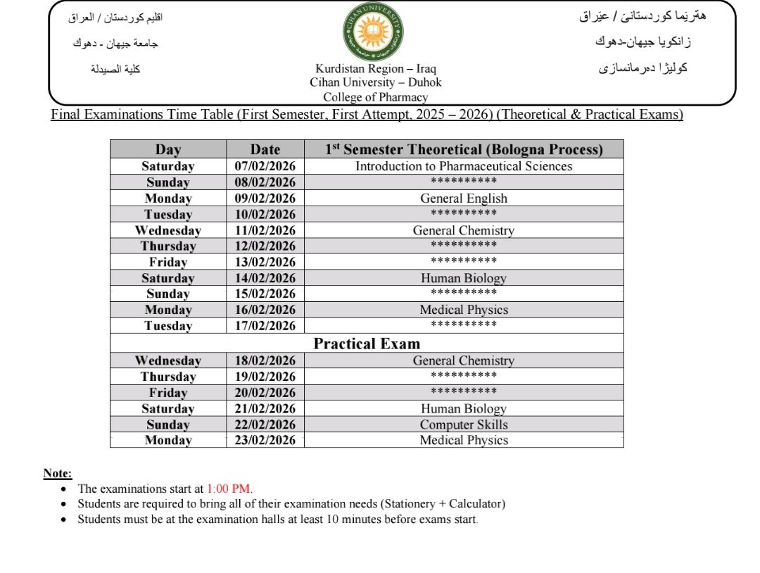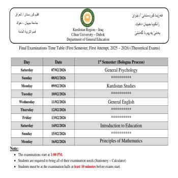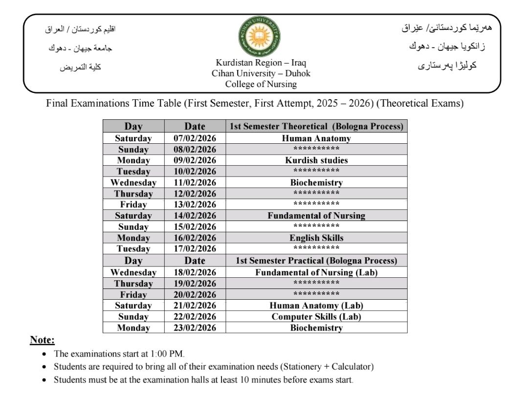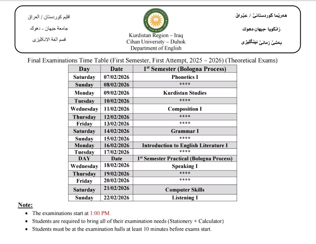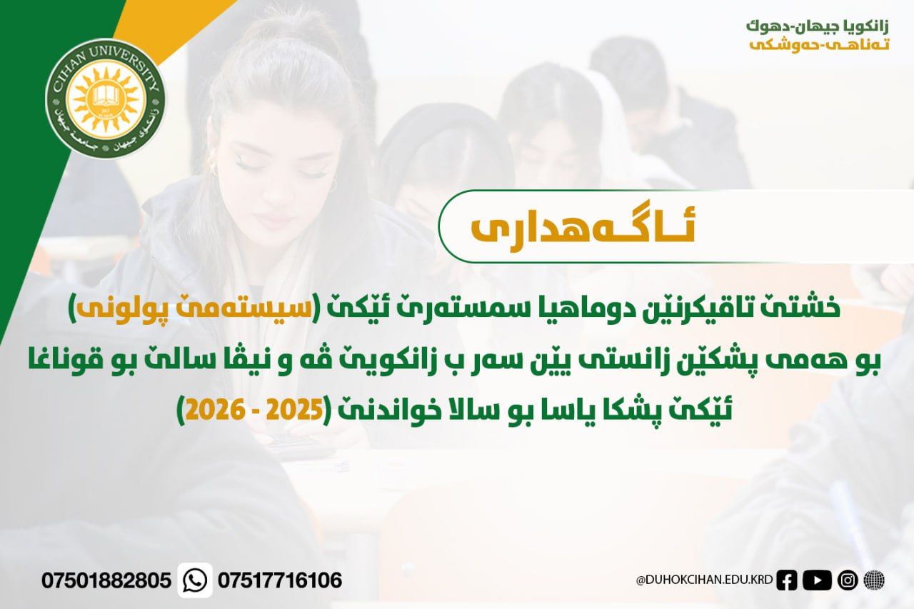 خشتێ تاقیکرنێن دوماهیا سمستەرێ ئێکێ (سیستەمێ پولونی) بو هەمی پشکێن زانستی یێن سەر ب زانکویێ ڤە و نيڨا سالێ بو قوناغا ئێکێ پشکا یاسا بو سالا خواندنێ (2025 - 2026) کو دێ هێنە ئەنجام دان ل روژا شەمبی رێکەفتی (07.02.2026) ل دەمژمێر 1:00 نیڤرو.