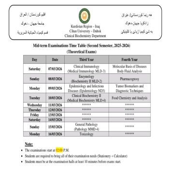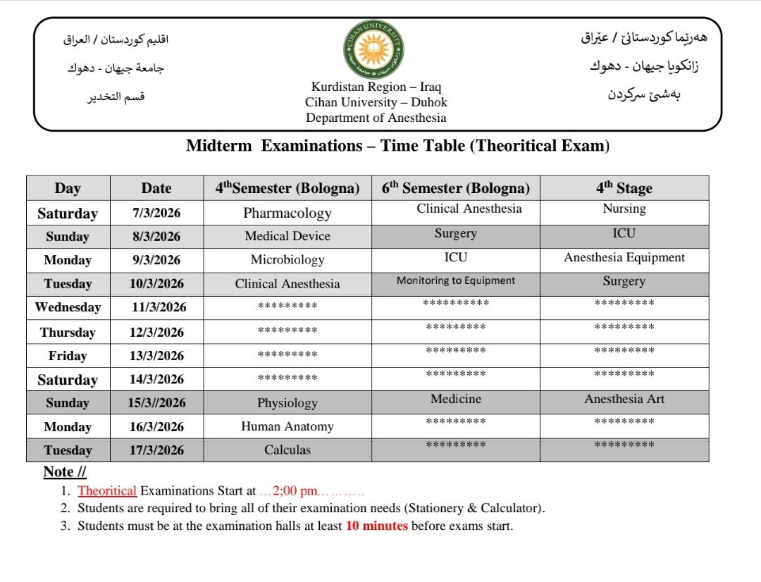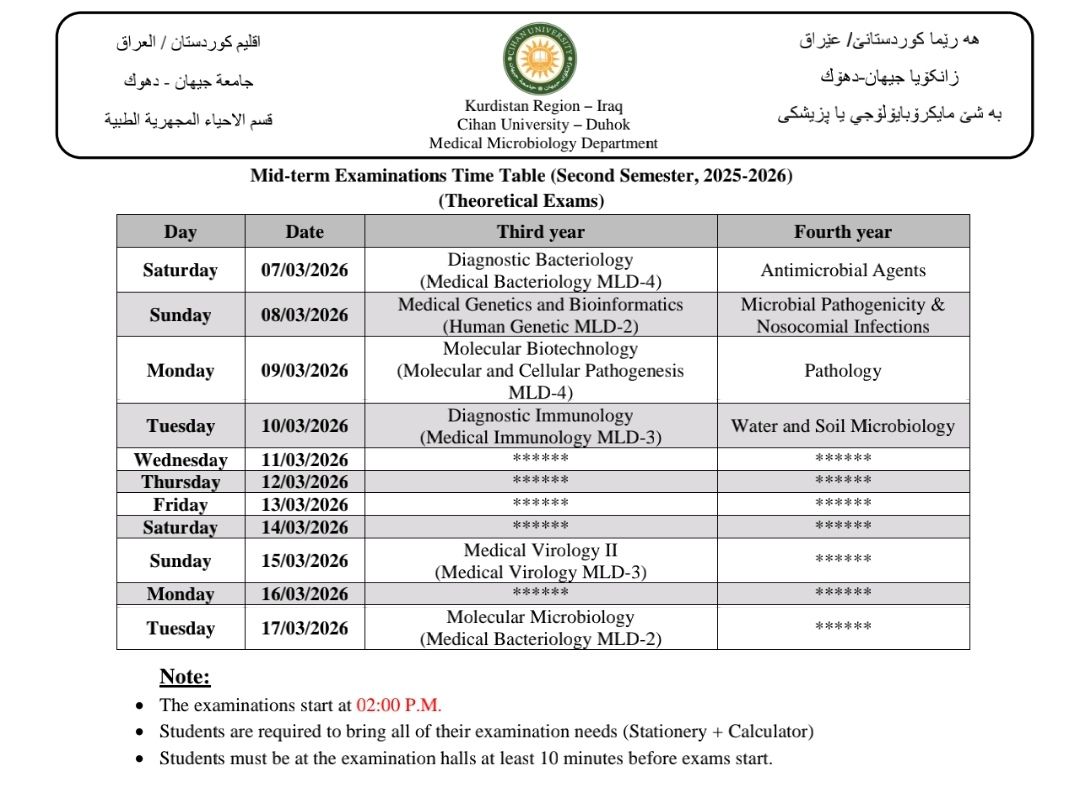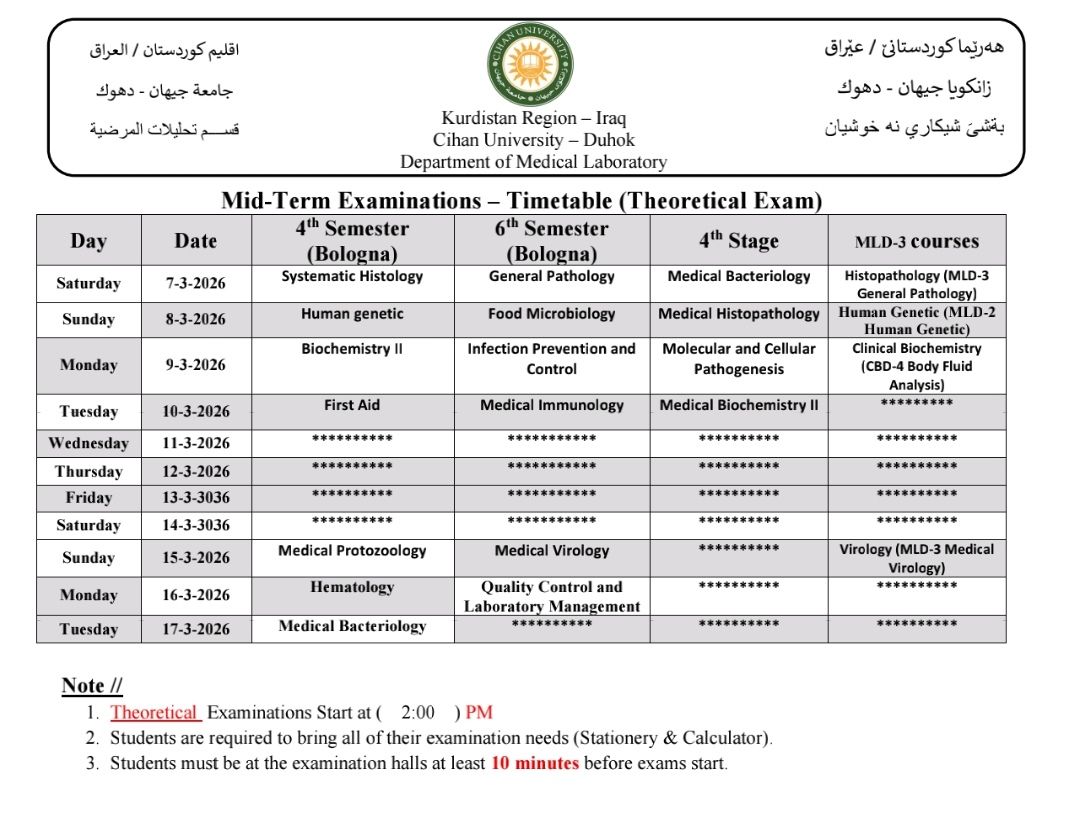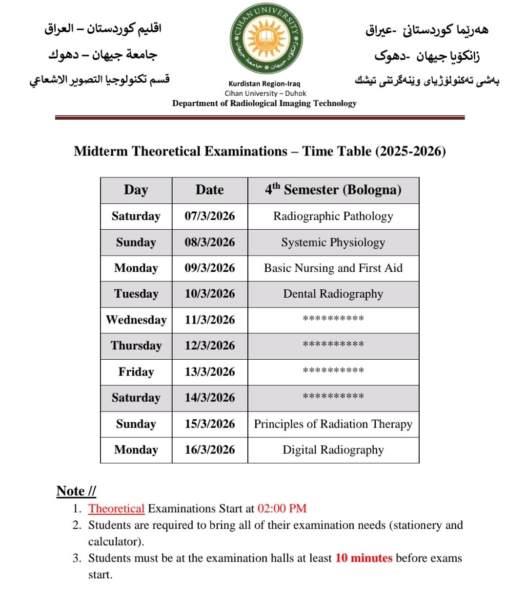 خشتێ تاقیکرنێن نیڤا کورسێ دووێ یێن تیوری (نظري) بو قوناغێن دووێ (و سمستەرێ چوارێ سیستەمێ پولونی)، قوناغا سيێ (و سمستەرێ شەشێ سیستەمێ پولونی) و قوناغا چوارئ یێن پشکێن زانستی (شیکاری نەخوشیان، سڕکردن، مایکرو بایولوژیا پزیشکی، کیمیا ژیانی یا کلینیکی، تەکنولوژیا وێنەگریا تیشکی) بو سالا خواندنێ (2025 - 2026) کو دێ هێنە ئەنجام دان ل روژا شەمبی رێکەفتی (7/3/2026) ل دەمژمێر 2:00 پشتی نیڤرو.