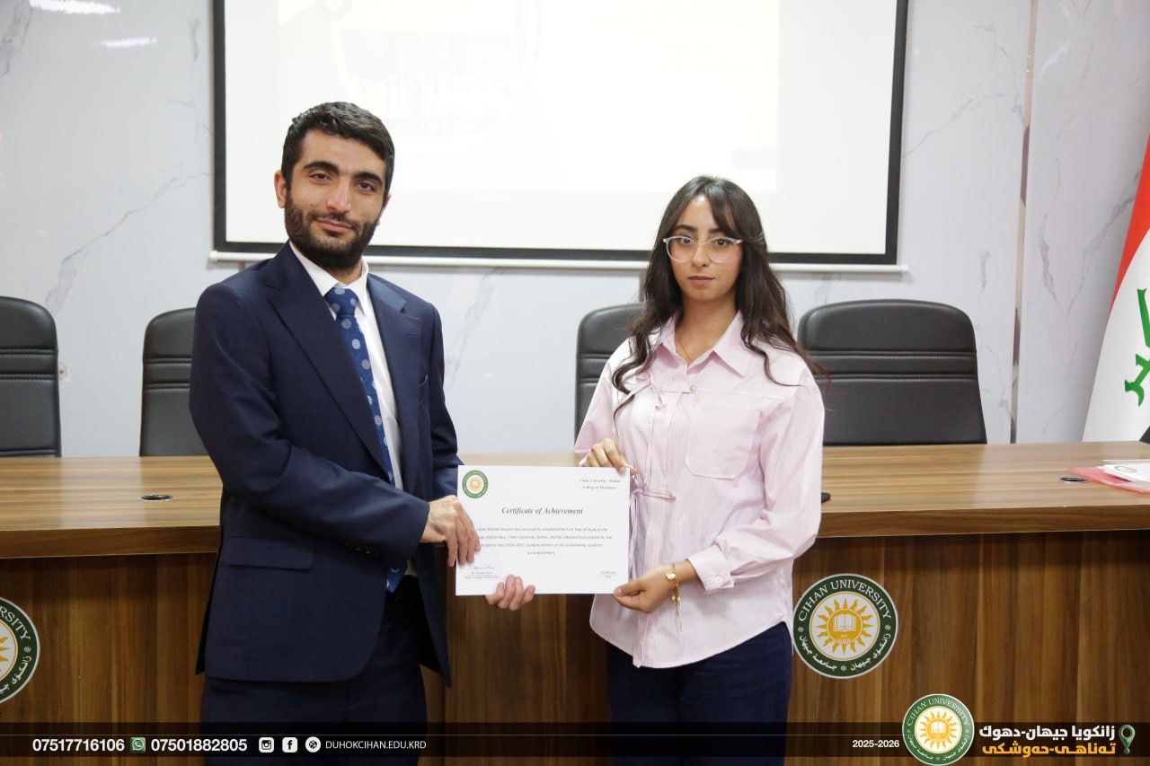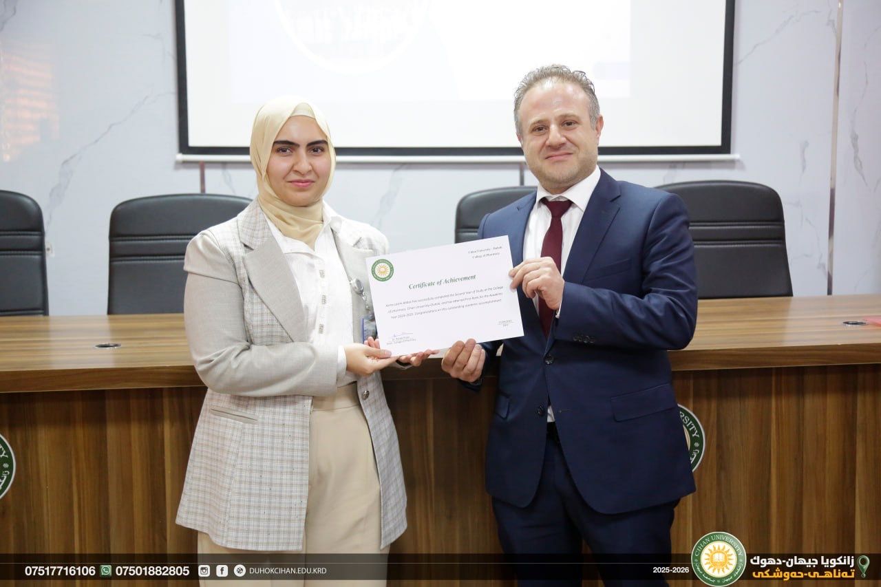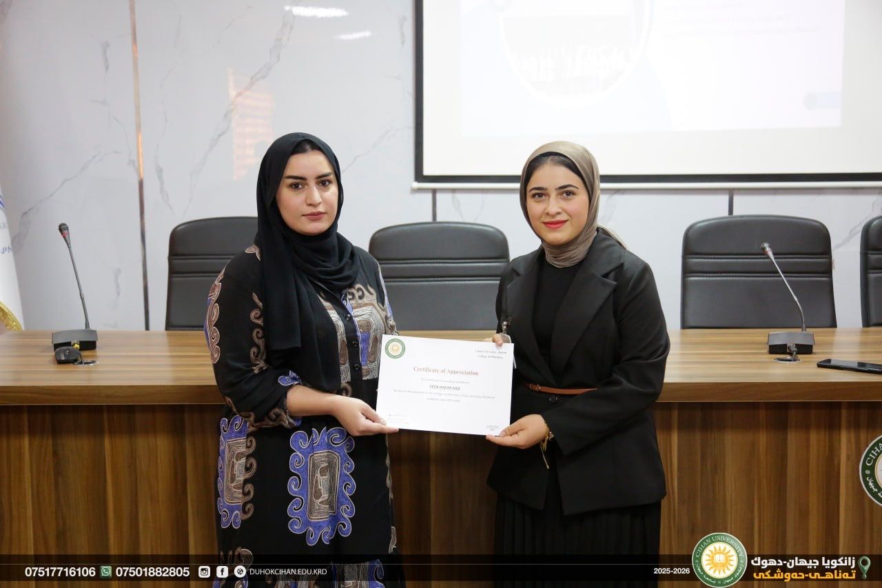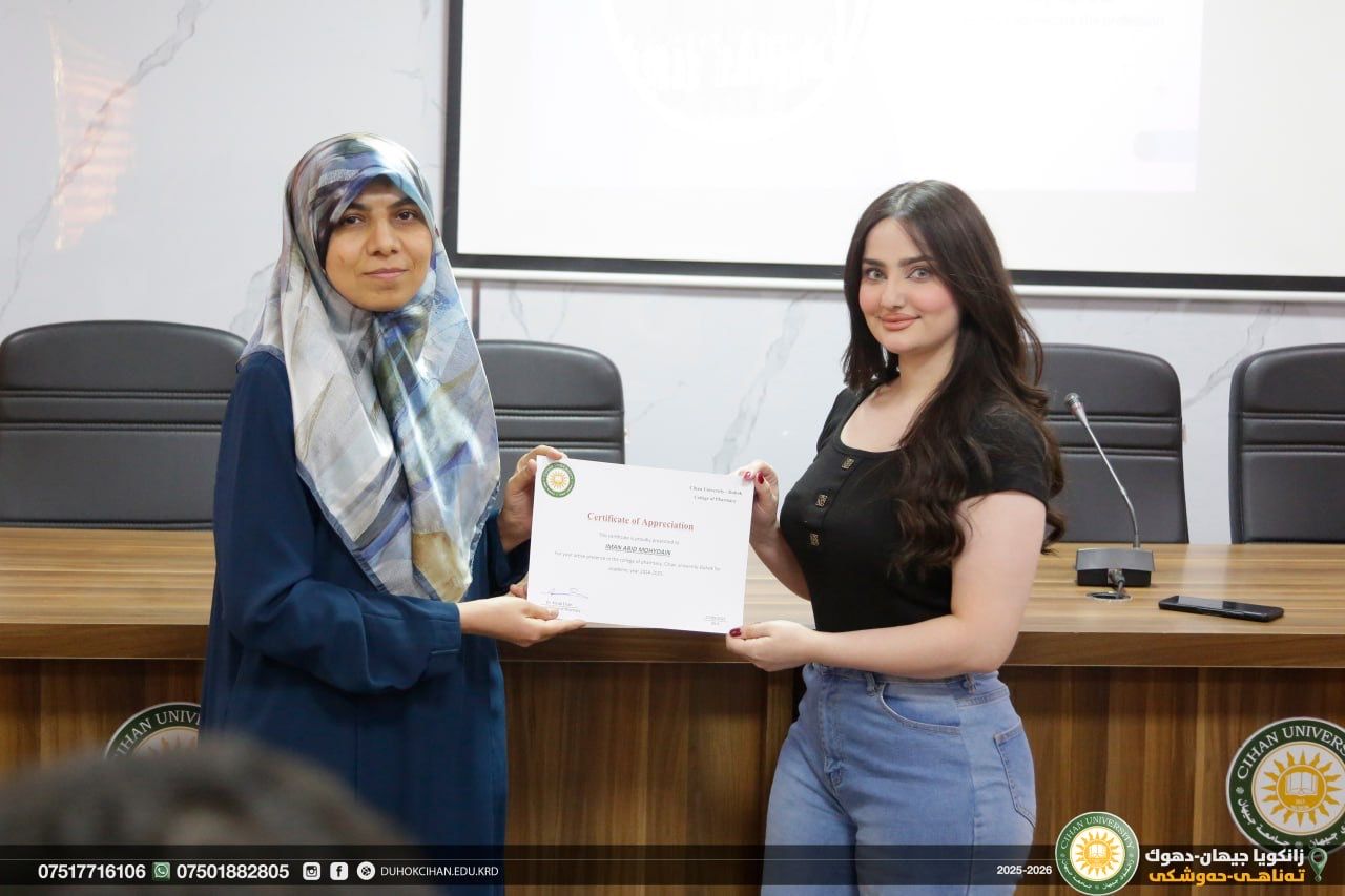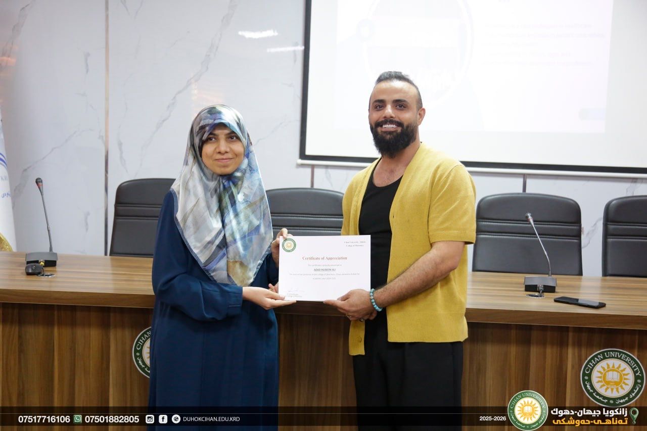 The College of Pharmacy at Cihan University–Duhok celebrated World Pharmacists Day by organizing a workshop that highlighted the history of pharmacy, the ethics of the profession, and the major branches of the field, along with pathways for specialization in various pharmacy-related careers. The workshop also emphasized the vital roles pharmacists play in different scientific and professional sectors. In recognition of their outstanding efforts and achievements, certificates of appreciation were awarded to top-performing and active students of the college. In recognition of their efforts and achievements during the 2024/2025 academic year, certificates of appreciation were awarded to the top-performing and most active students of the college.