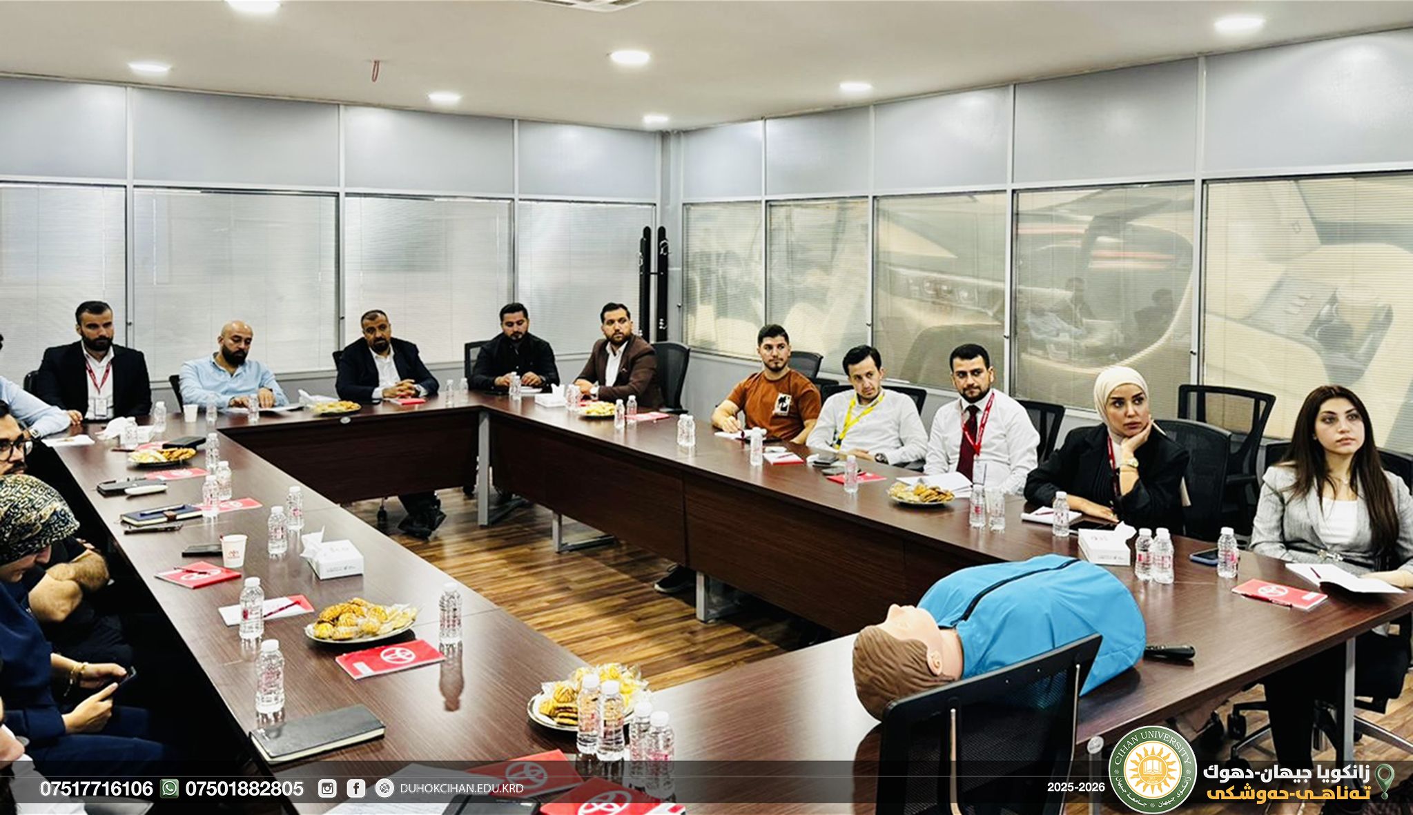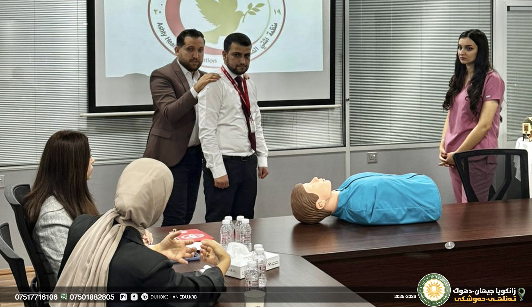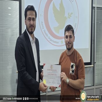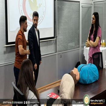 (Mr. Rayan Sadeeq Ahmed) the Director of the medical Laboratories at Cihan-Duhok University, with (Mr. Bassam Shoukat Ismail) a Teaching Assistant in the Medical Laboratories, together with members of the Cihan Group, participated in the medical awareness and First Aids workshop by cihan groups held at the Cihan Motors Office in Duhok.