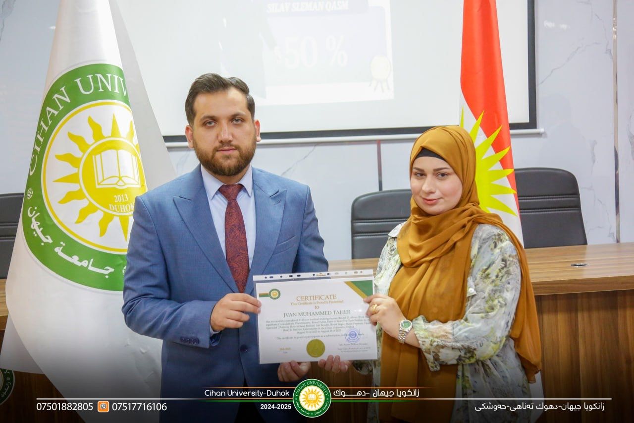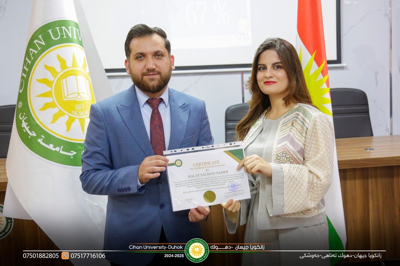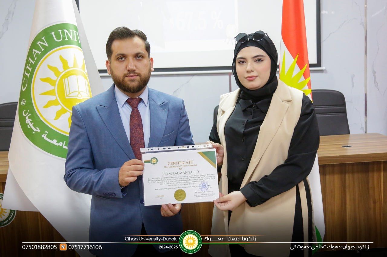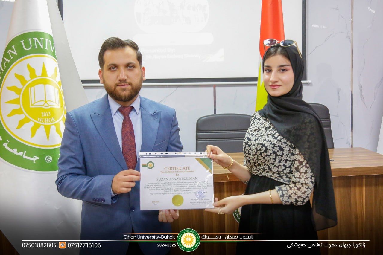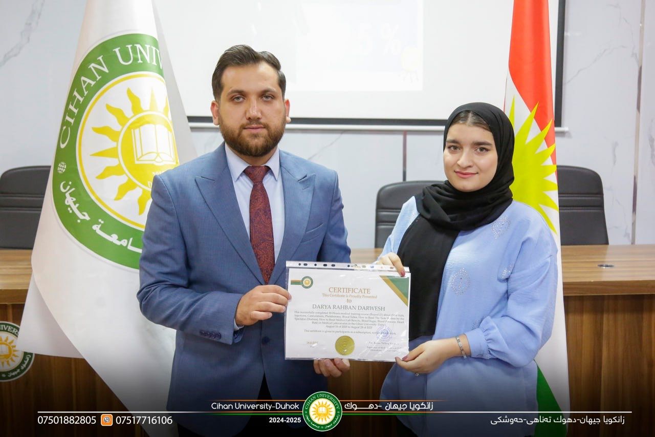 On 2025/08/28 the closing ceremony of the medical course (Round 21 & 22) under the supervision of international medical trainer (Mr. Rayan Sadeeq Ahmad) Decision Maker and Supervisor of Medical Laboratories at Cihan University - Duhok and author of medical books, after 30 hours of teaching and training and conducting evaluation experience Level of students Graduation certificates were distributed to the participants.