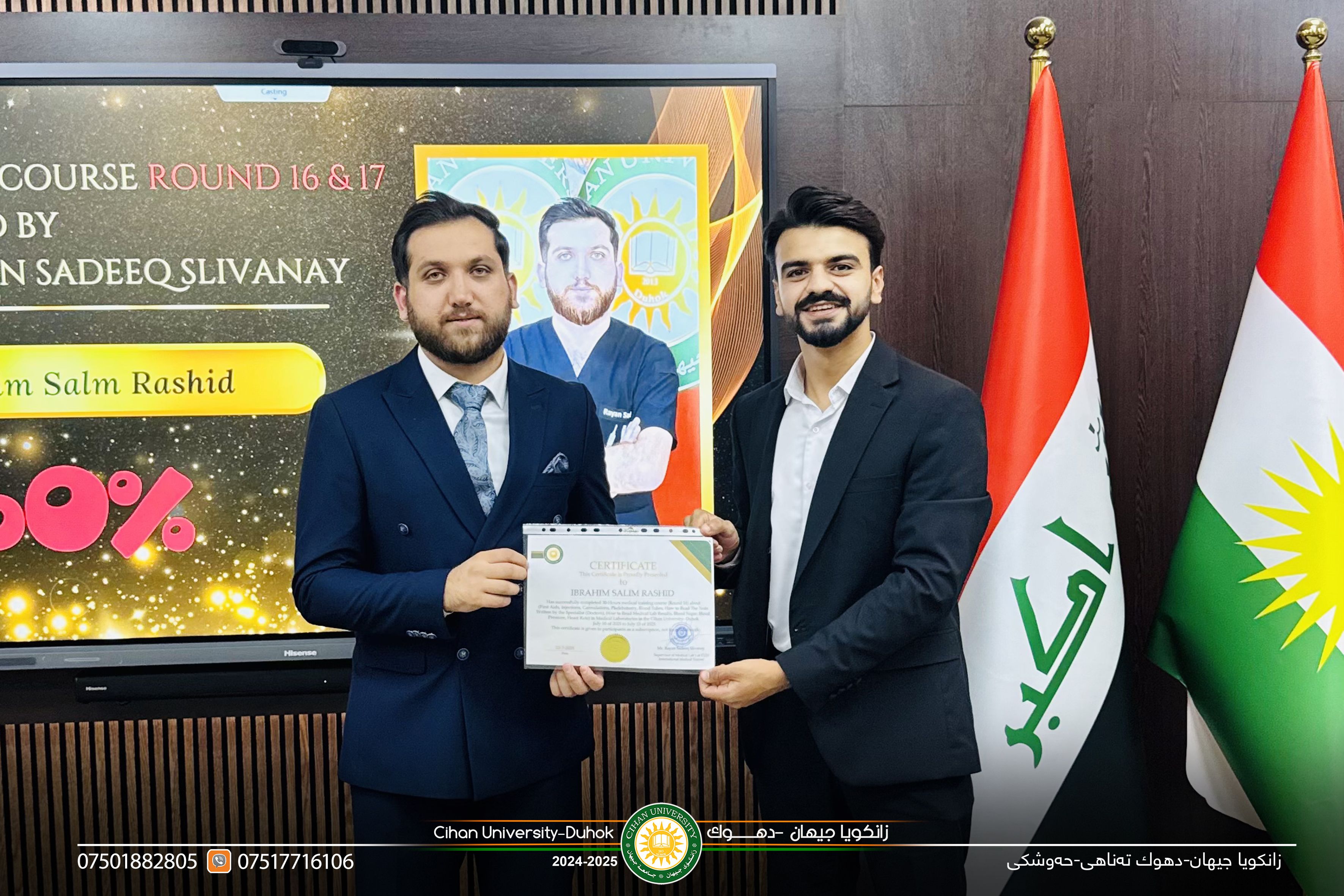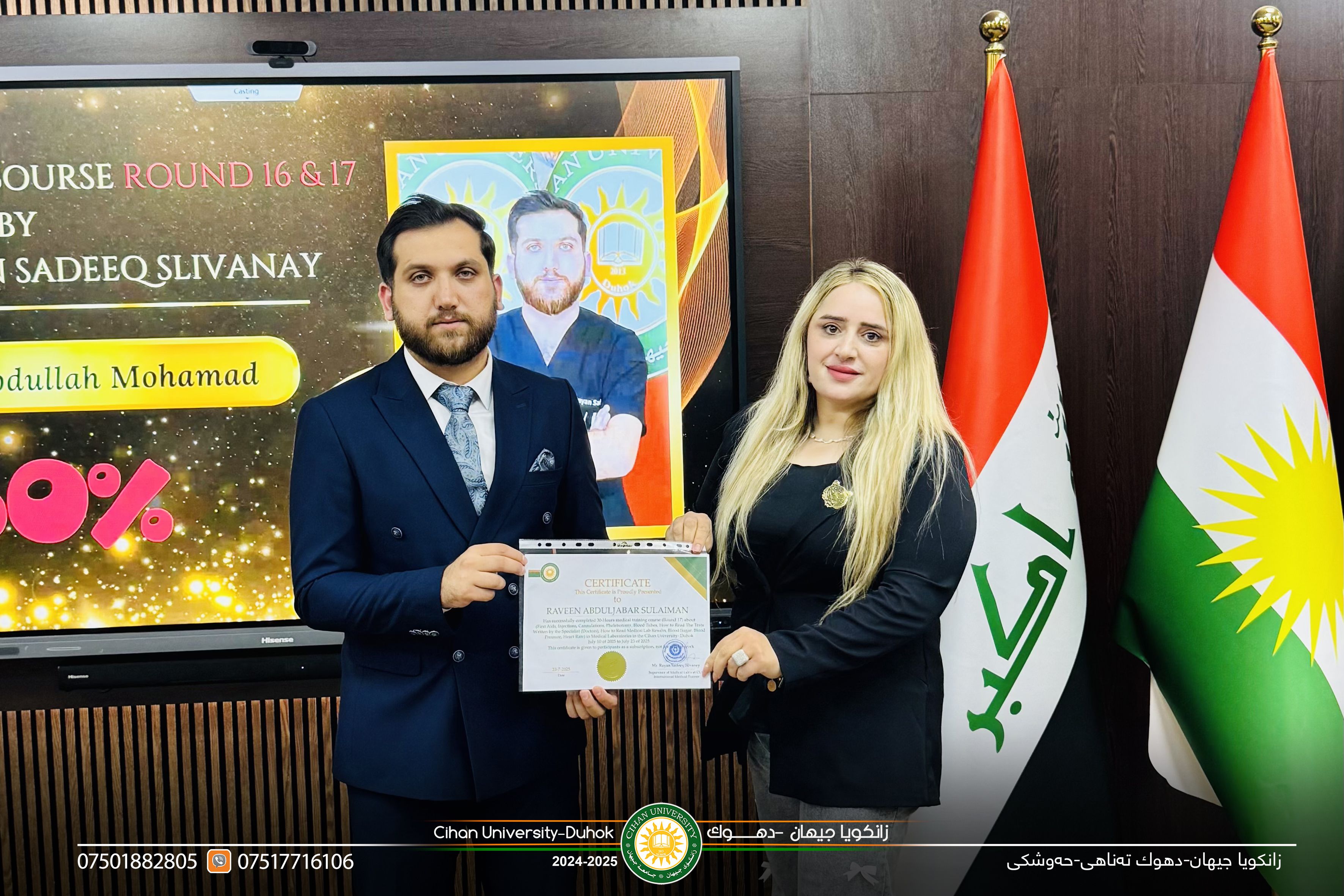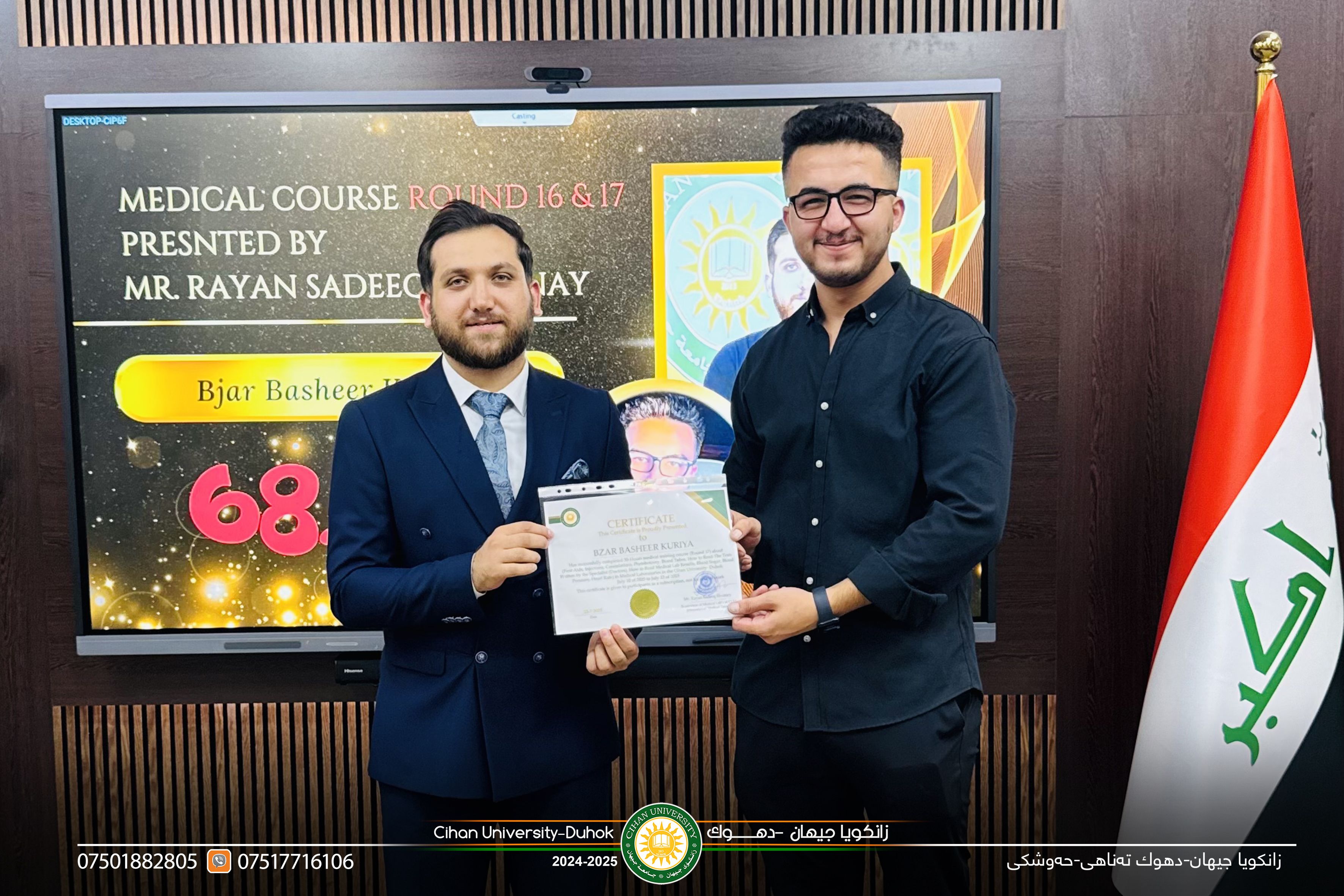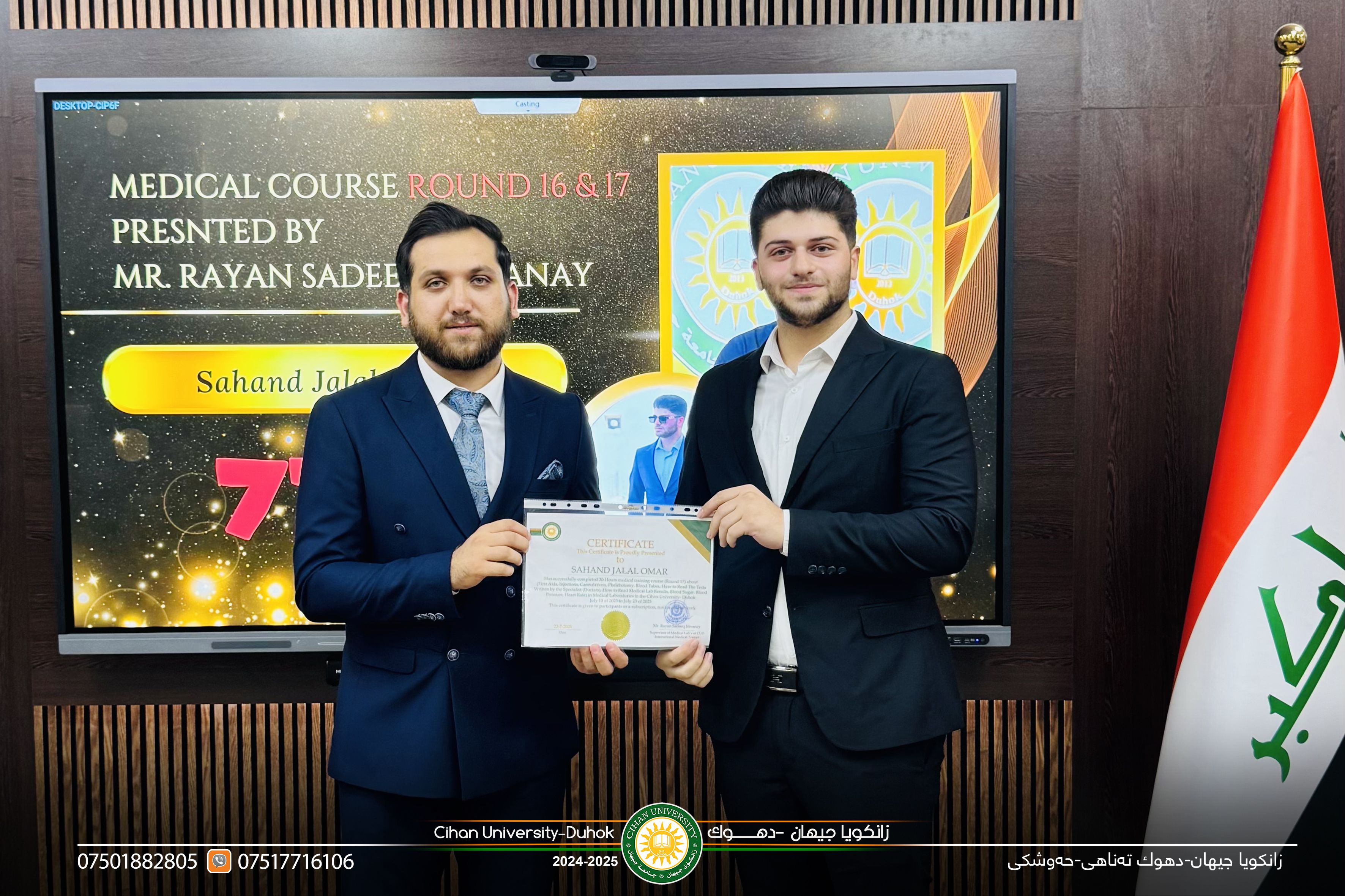 On 2025/07/23 the closing ceremony of the medical course (Round 16) under the supervision of international medical trainer (Mr. Rayan Sadeeq Ahmad) Decision Maker and Supervisor of Medical Laboratories at Cihan University - Duhok, after 30 hours of teaching and training and conducting evaluation experience Level of students Graduation certificates were distributed to the participants.