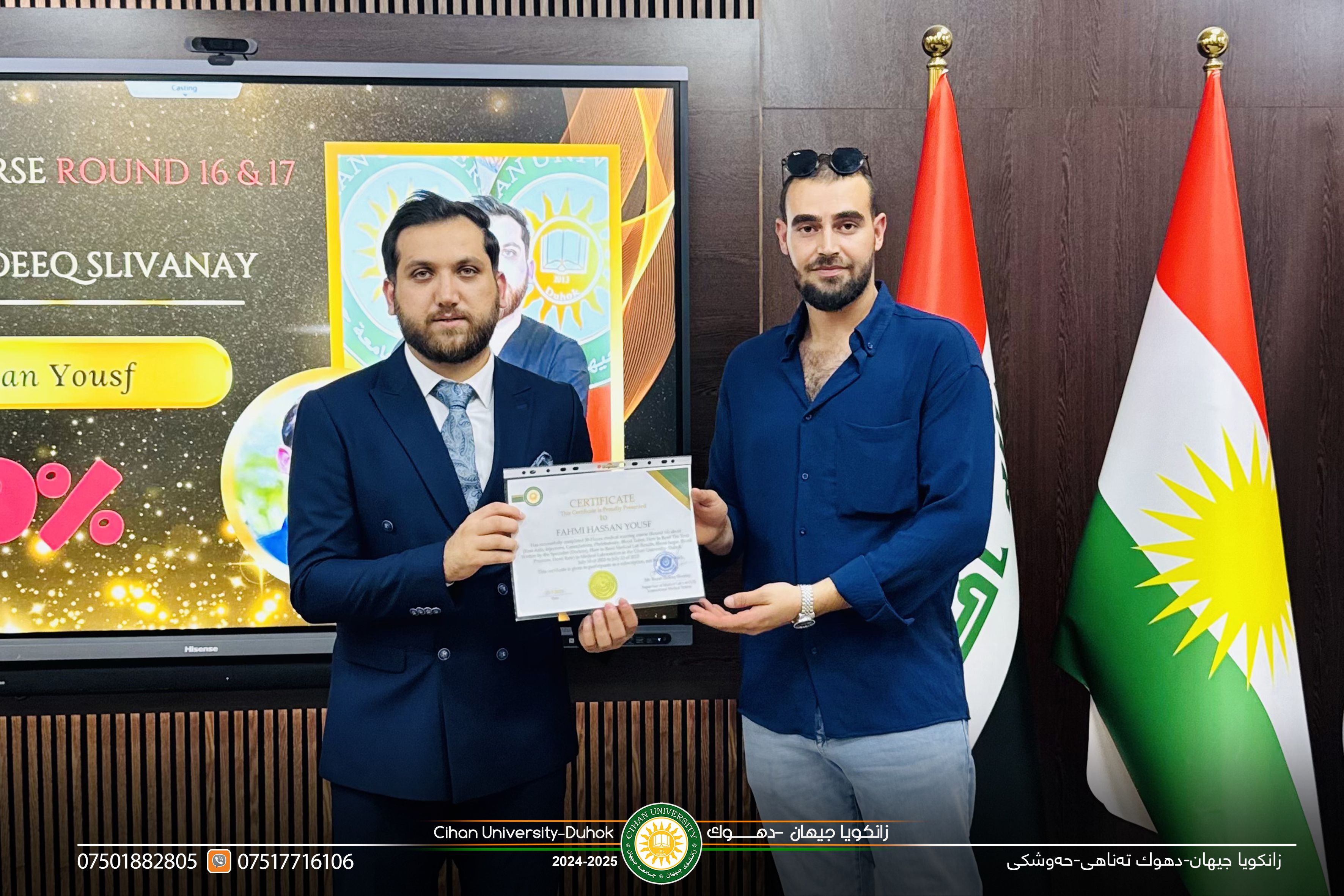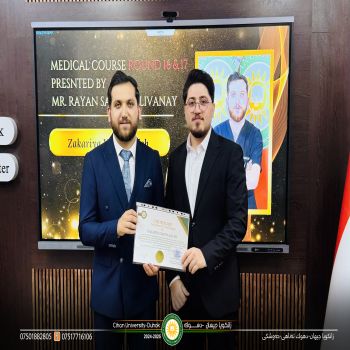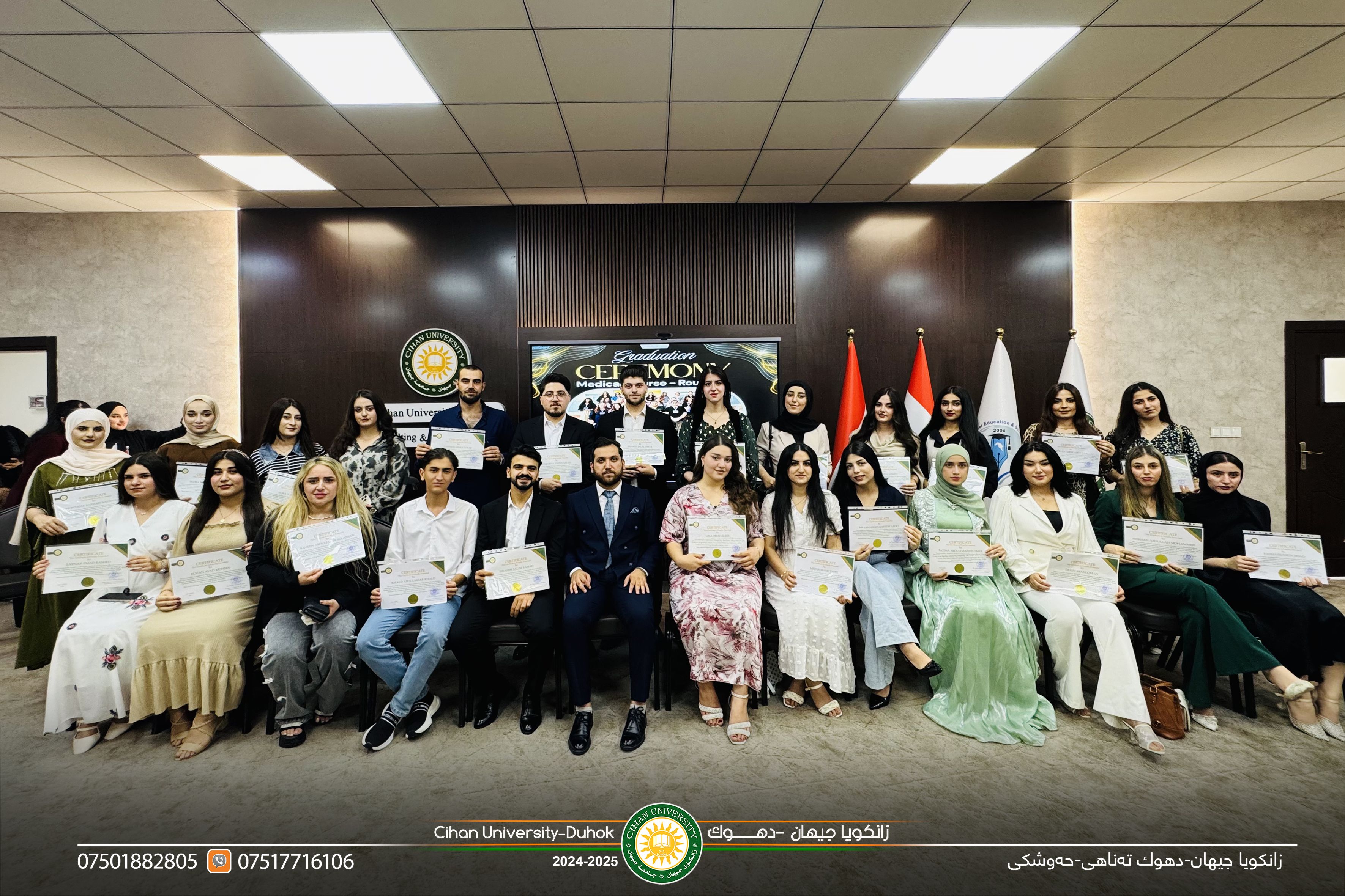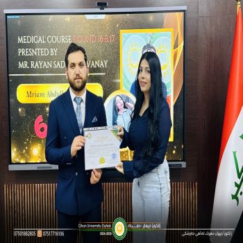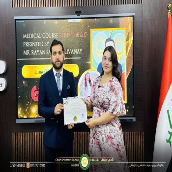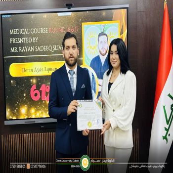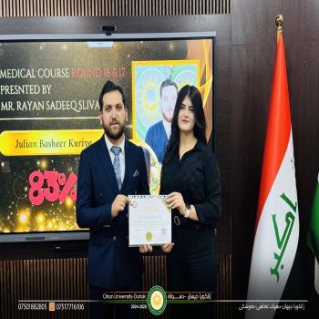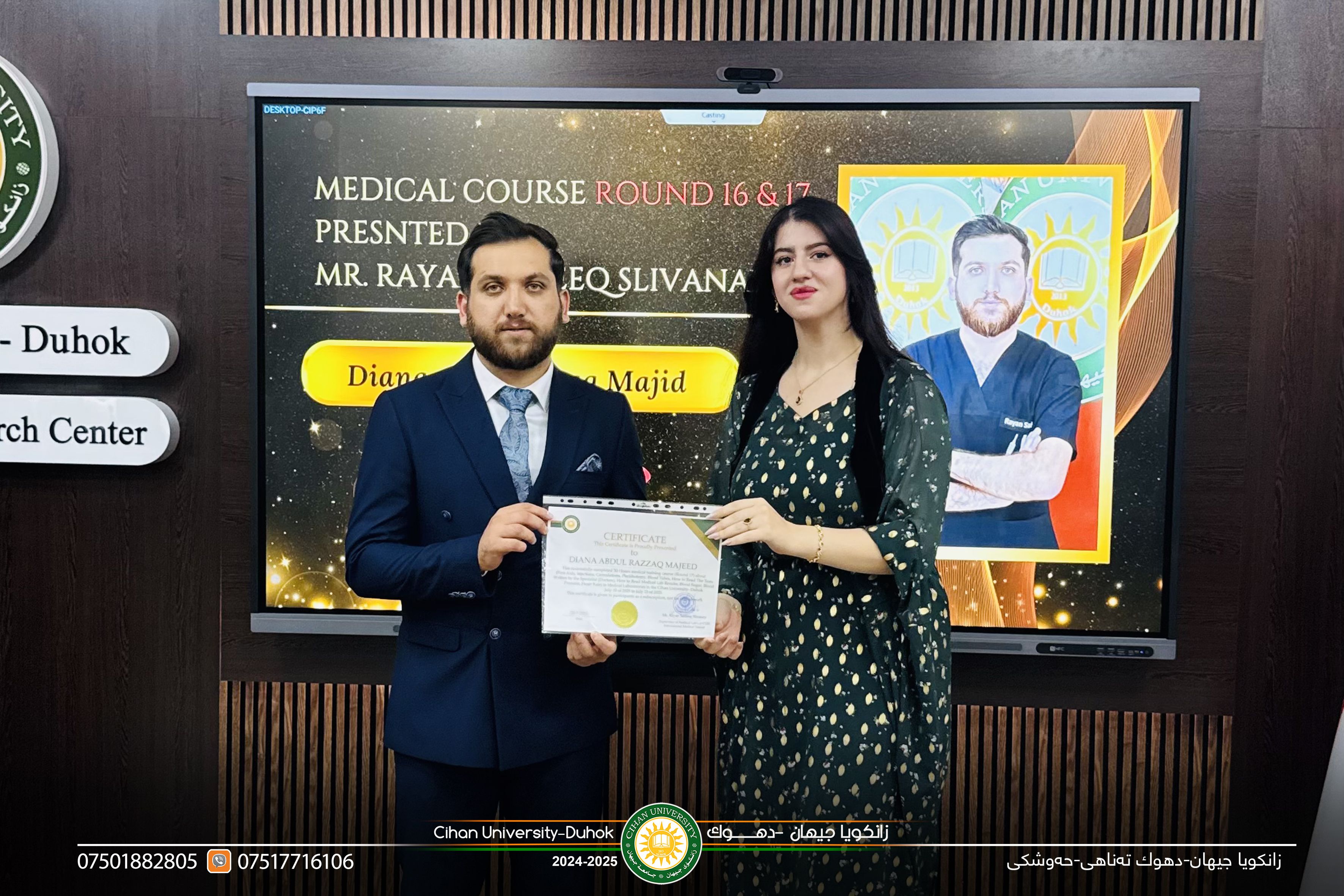 On 2025/07/23 the closing ceremony of the medical course (Round 16) under the supervision of international medical trainer (Mr. Rayan Sadeeq Ahmad) Decision Maker and Supervisor of Medical Laboratories at Cihan University - Duhok, after 30 hours of teaching and training and conducting evaluation experience Level of students Graduation certificates were distributed to the participants.