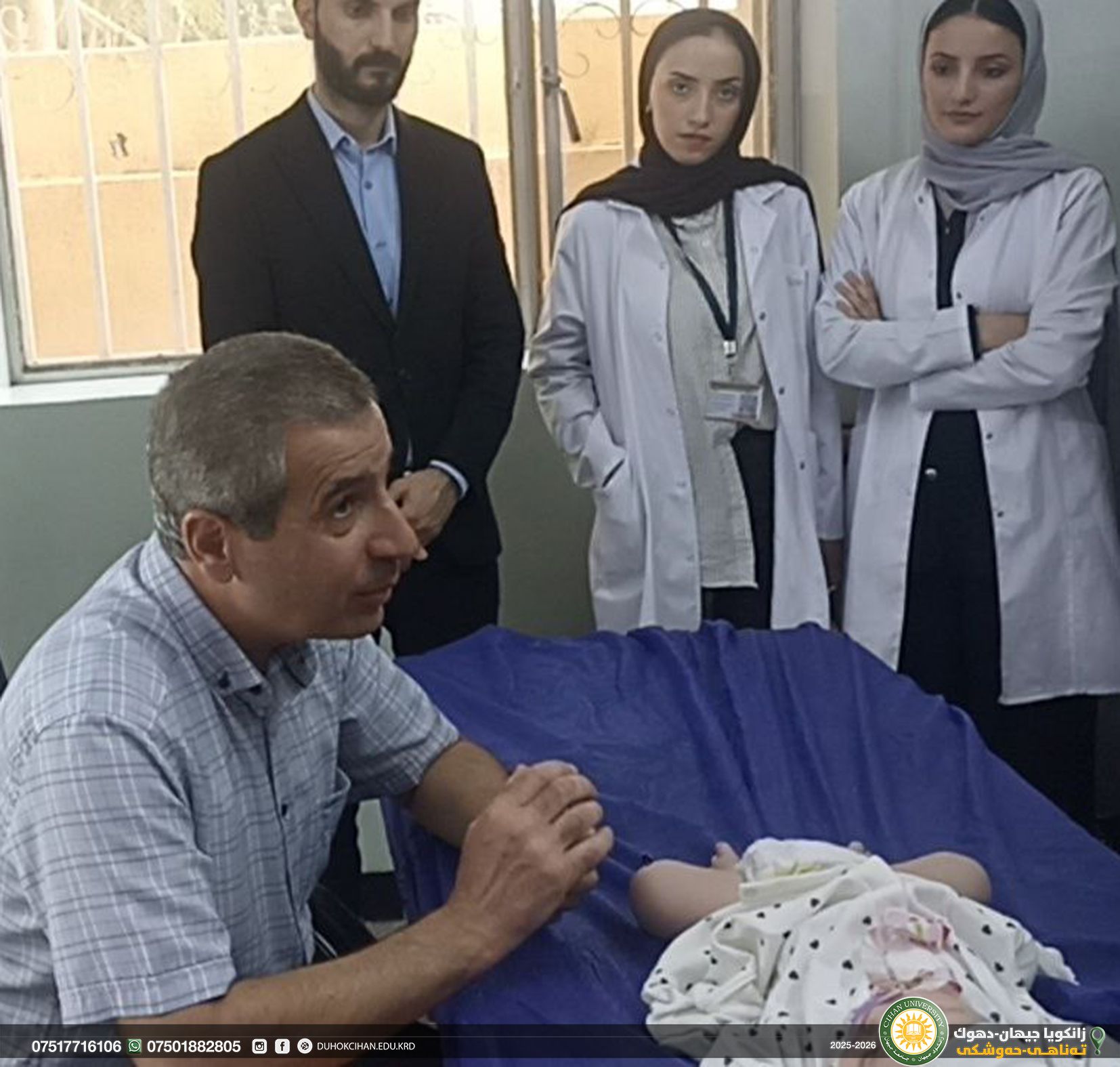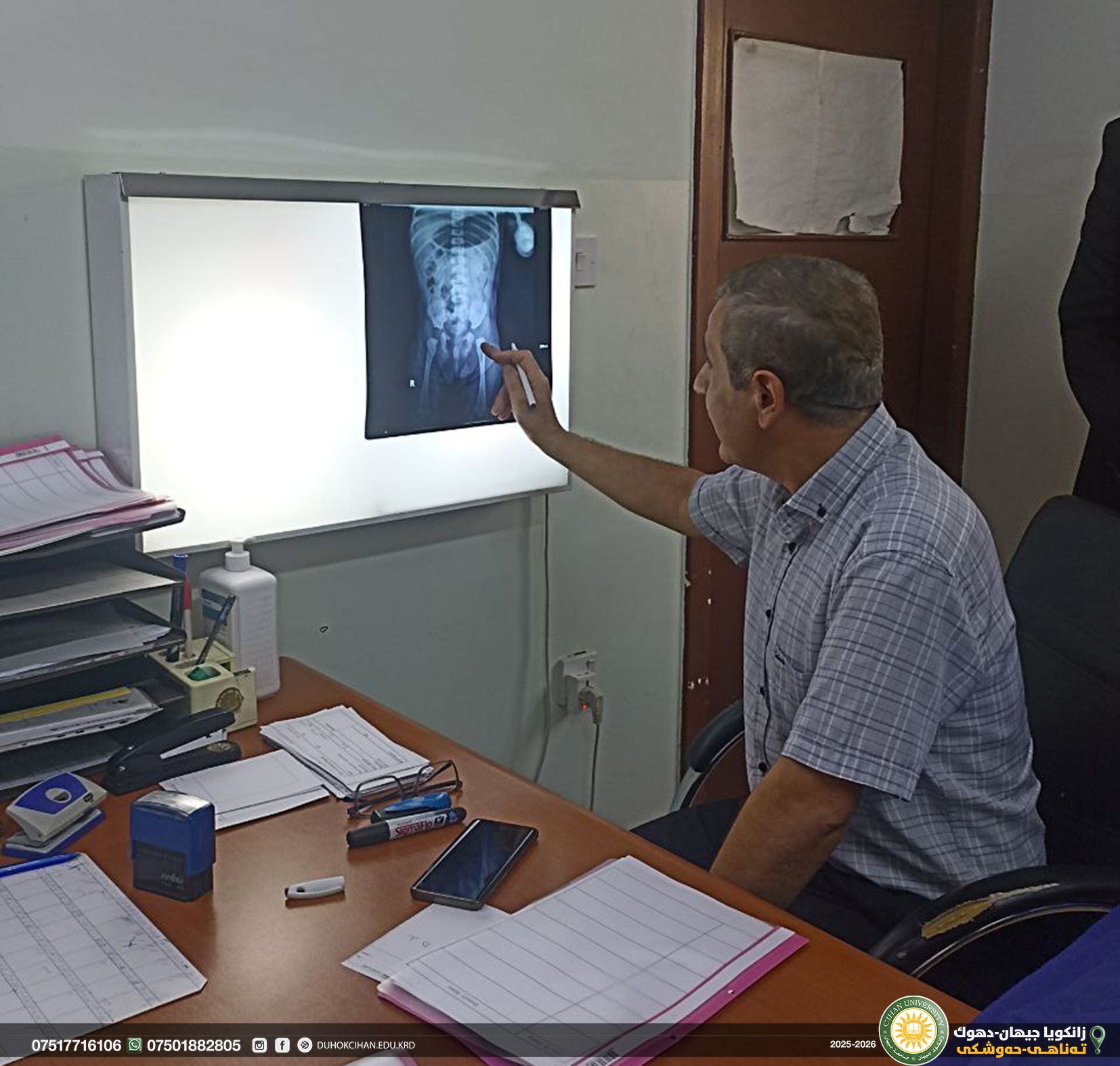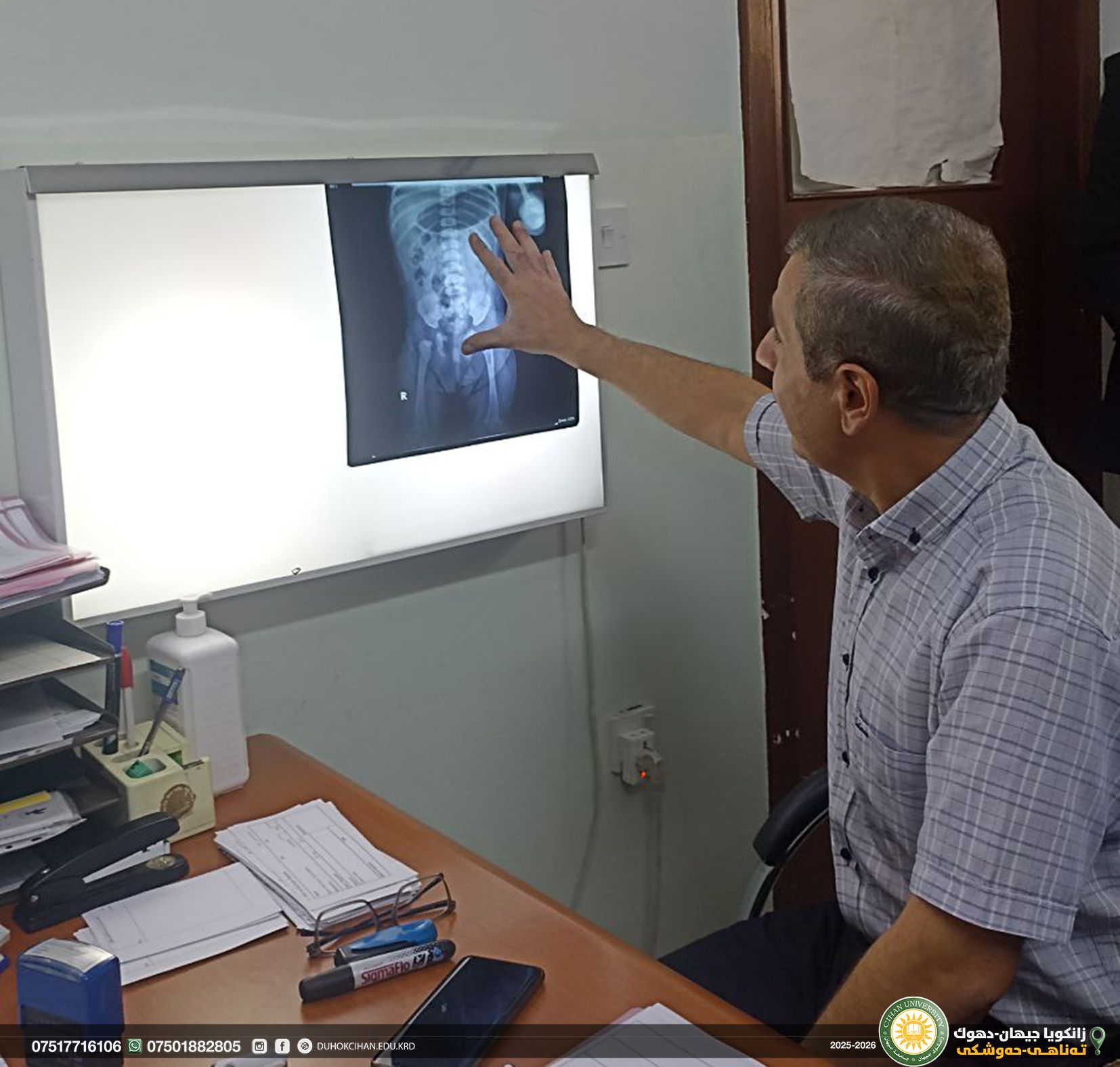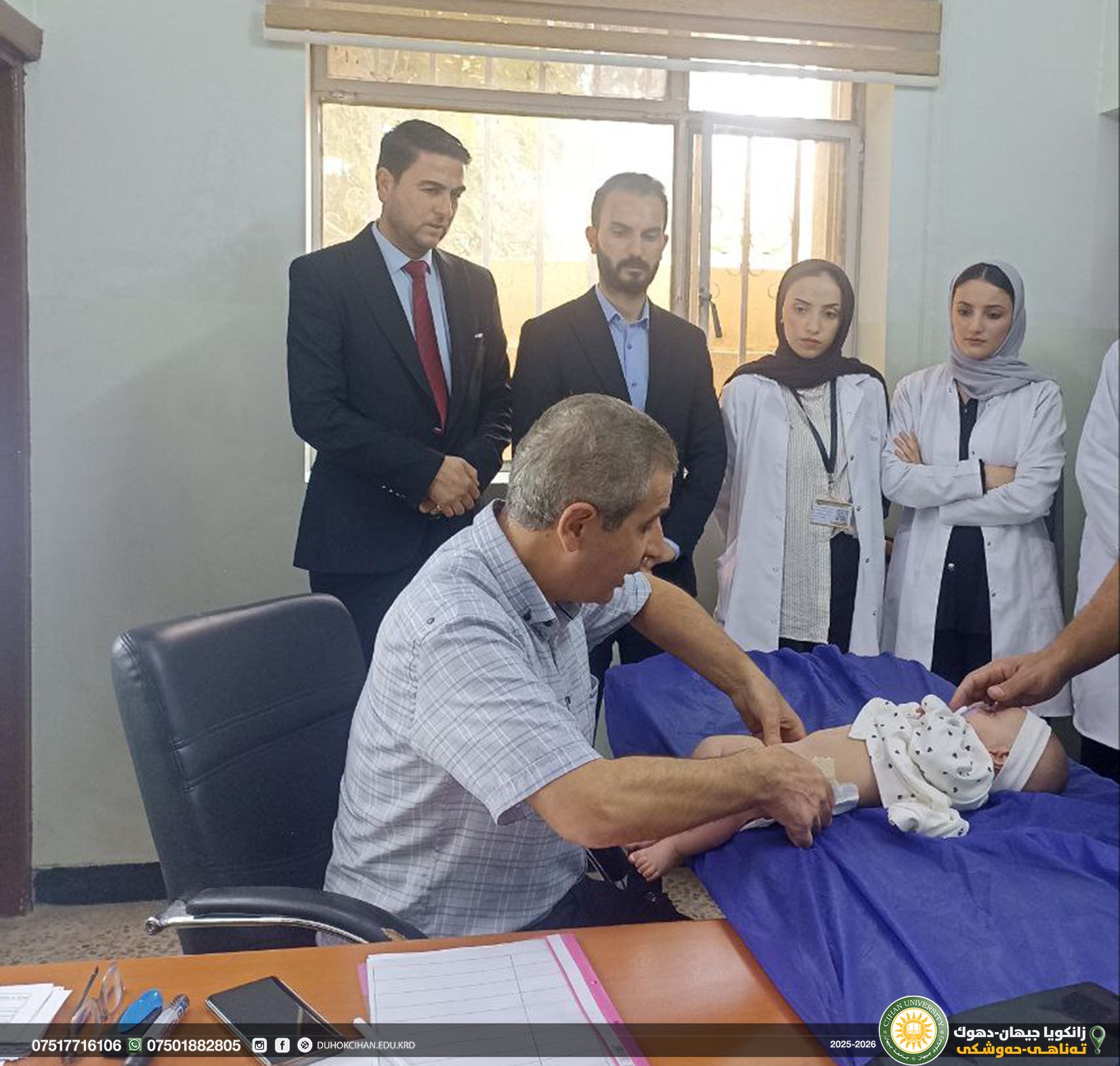 This visit aimed to familiarize students with the mechanism of early detection of Developmental Dysplasia of the Hip (DDH) by learning about the practical steps followed, starting from clinical examination to medical imaging, in addition to reviewing the radiological and ultrasound devices used in diagnosing this disorder and understanding their operation mechanism and adjusting their settings to suit the child's age. The visit was under the direct supervision of Dr. Jagar Omar Ahmed, who provided a comprehensive explanation of the examination and diagnostic methods adopted at the center.