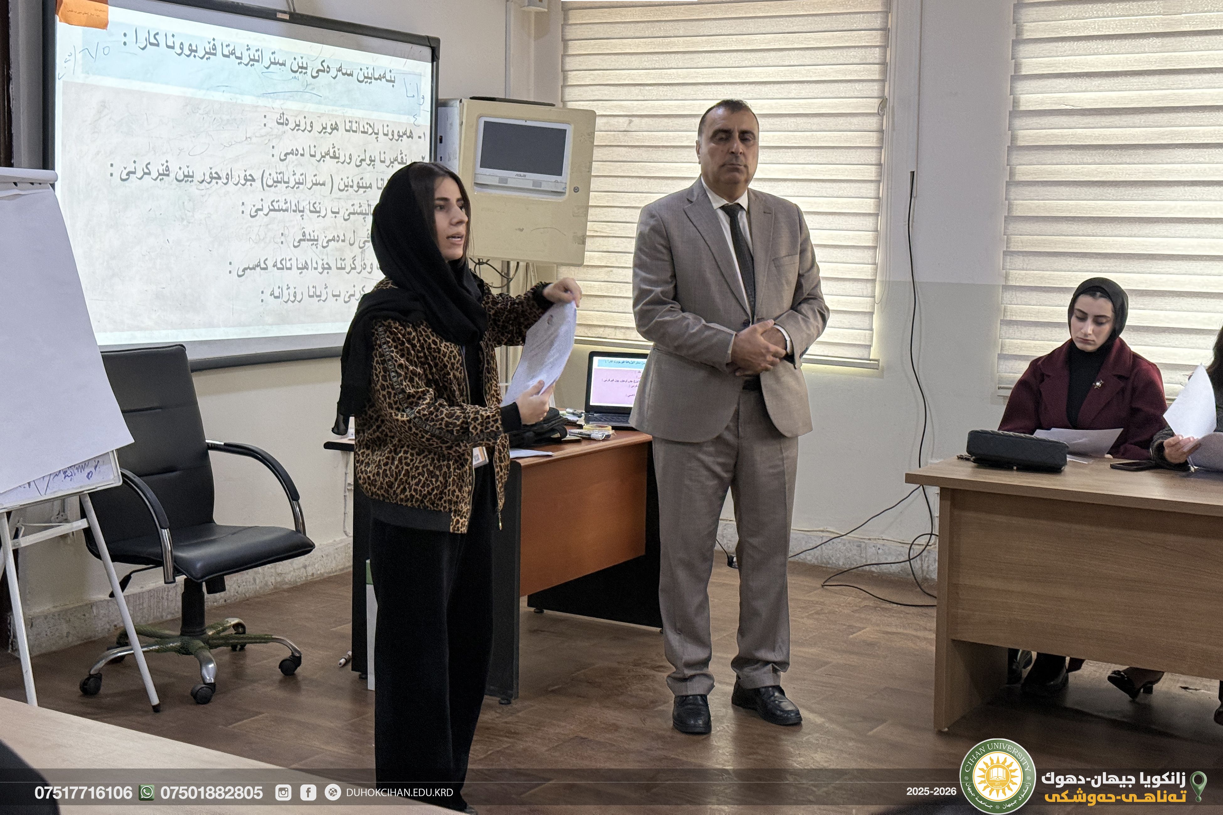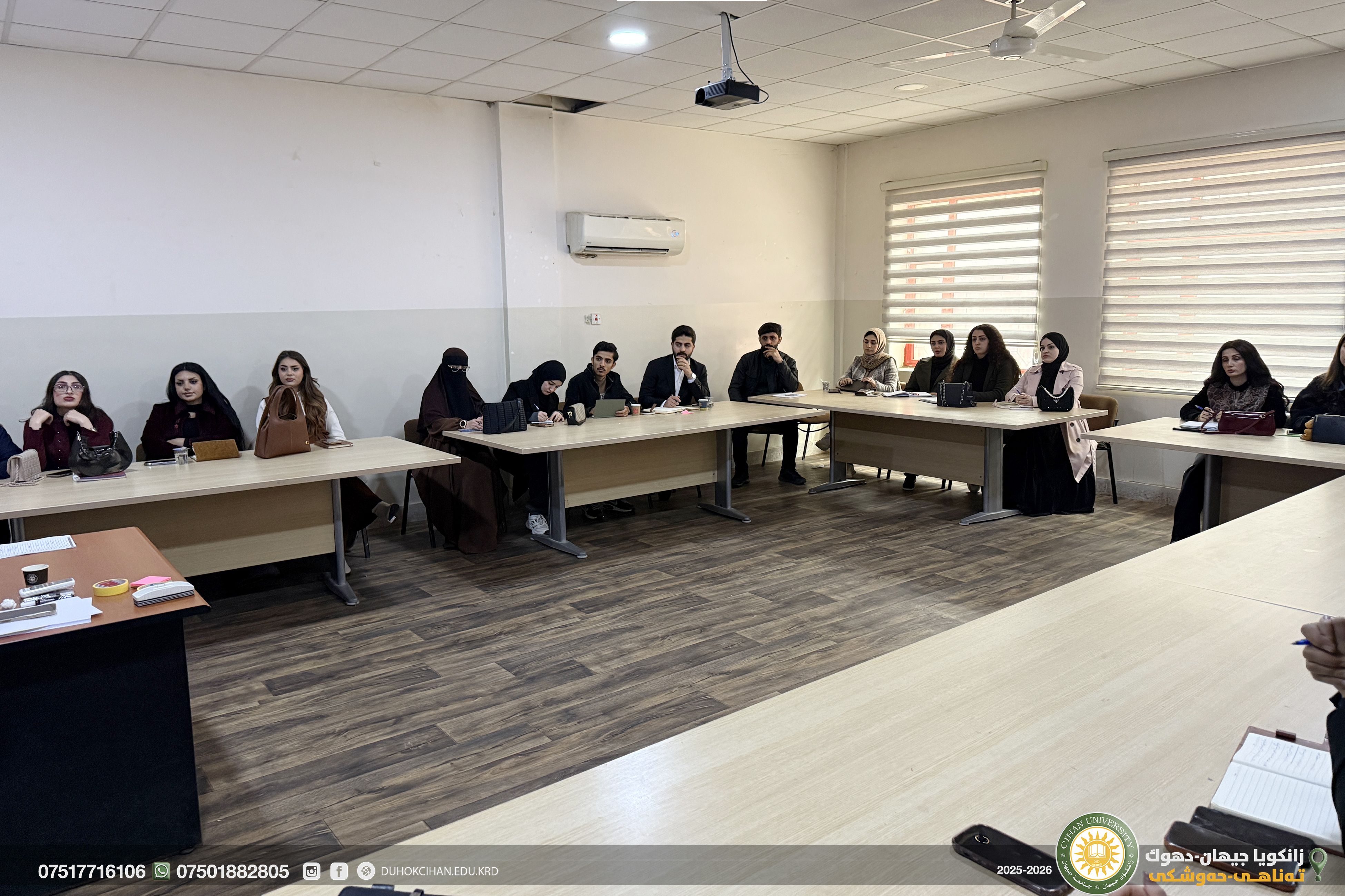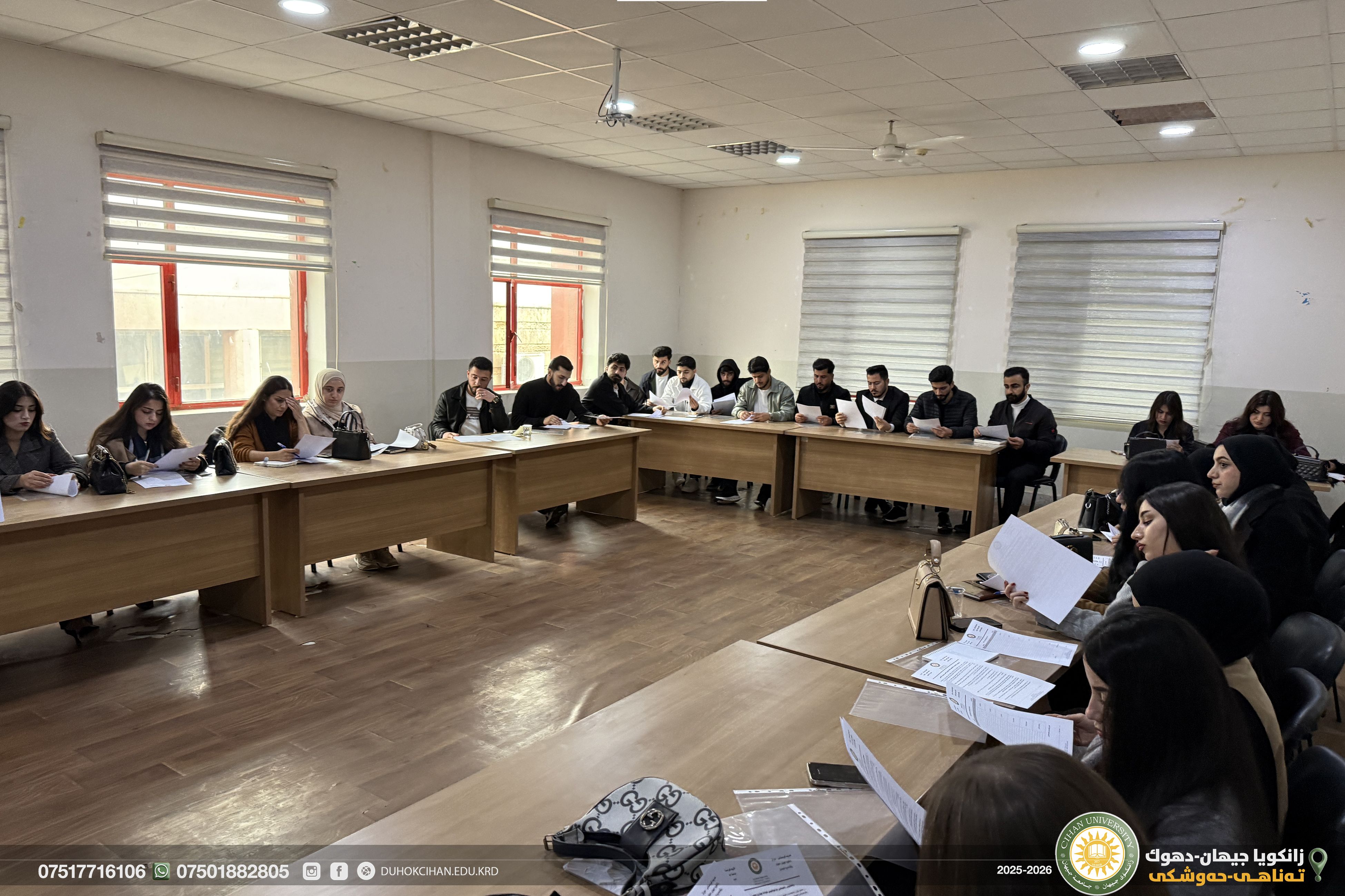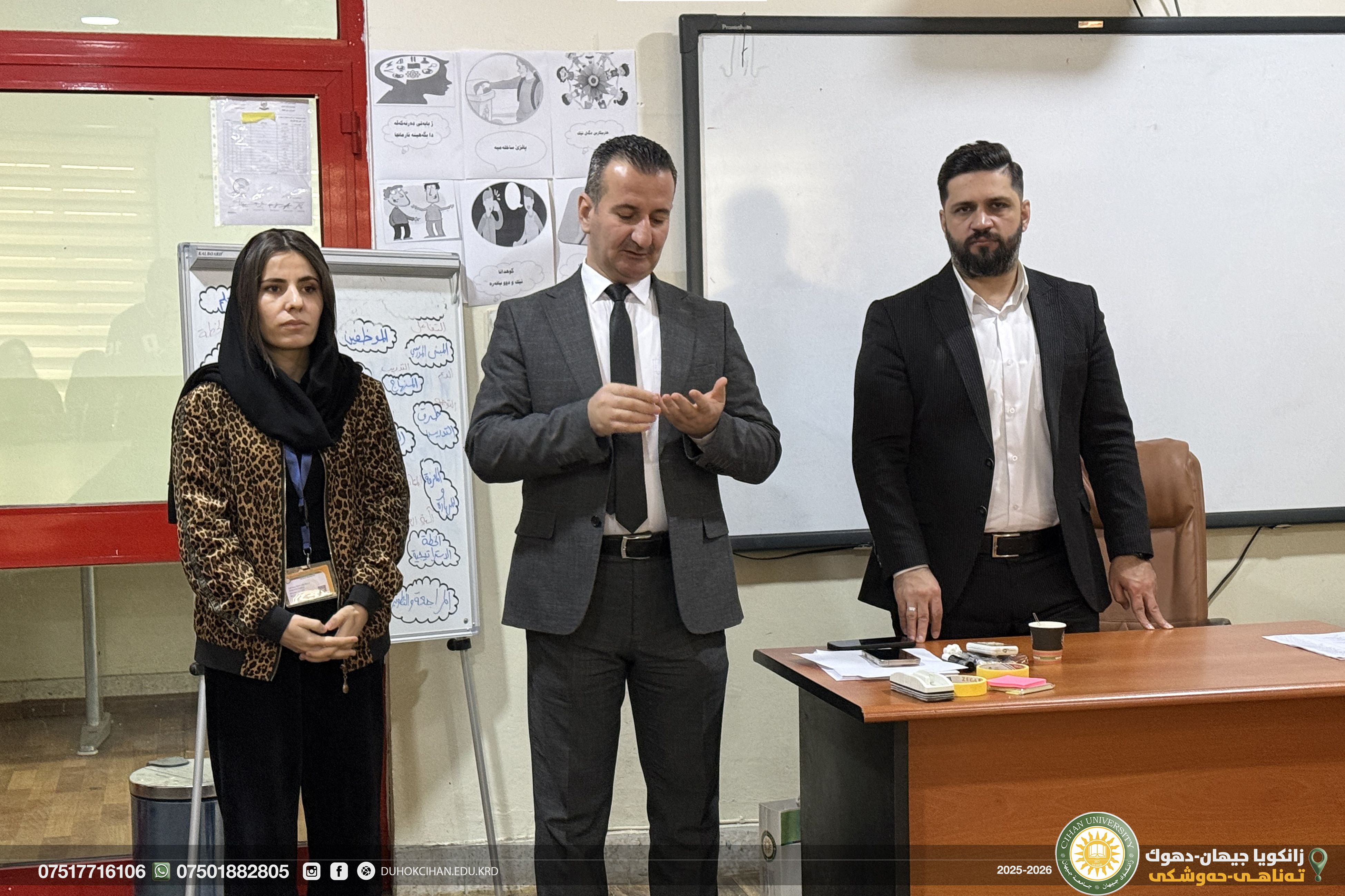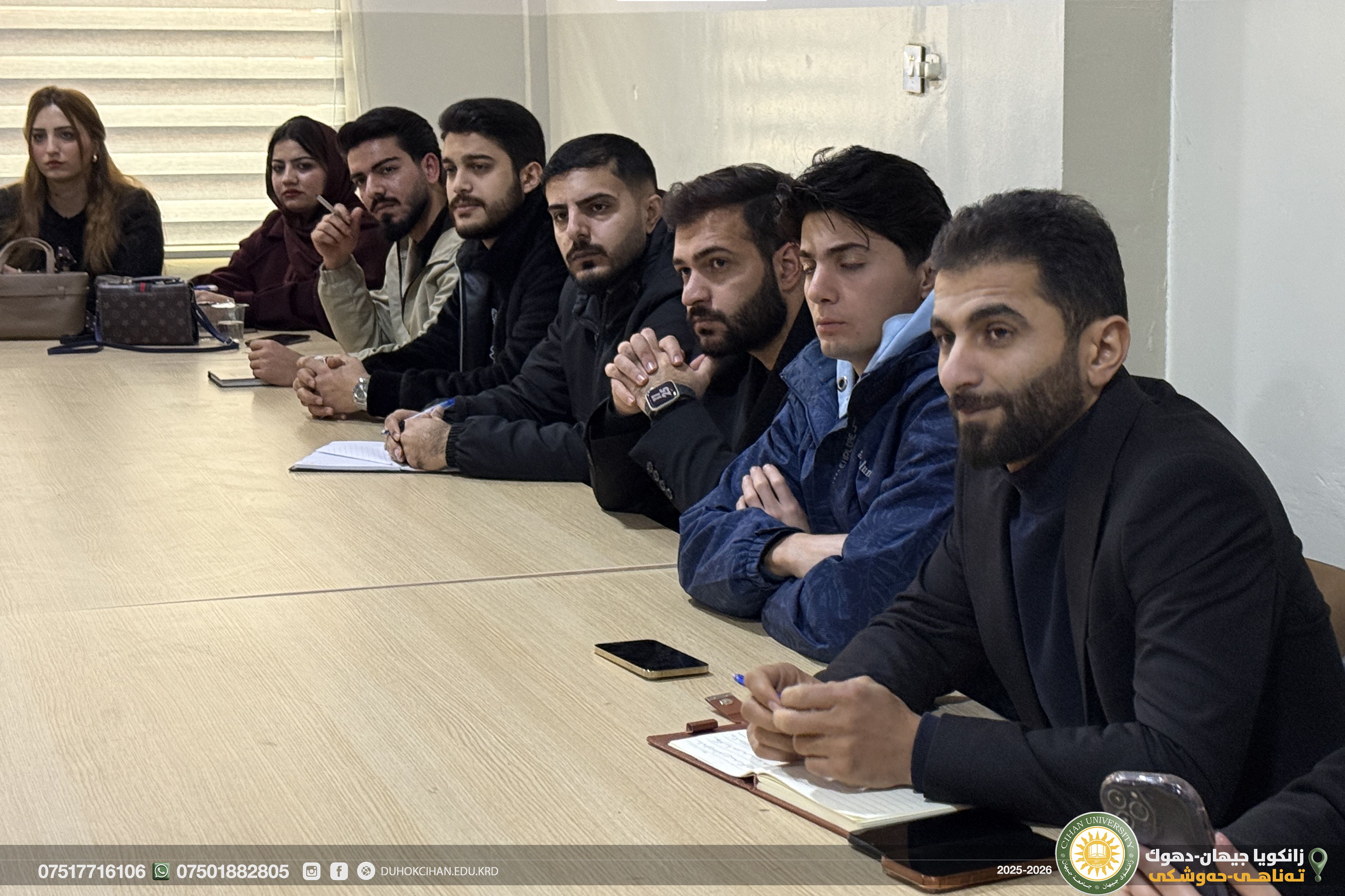 ضمن برامج مؤسسة زكاة العلم في جامعة جيهان-دهوك، أقيمت يوم الأحد الموافق 8/2/2026 ورشة عمل تخصصية لطلبة المرحلة الرابعة في قسمي (اللغة الإنجليزية وعلم النفس)، وذلك بالتعاون مع مديرية الإعداد والتدريب في دهوك.