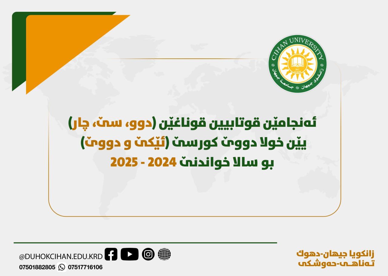 كوردى - عربي - English 📢 ئاگه‌هداریه‌كا گرنگ ده‌رباره‌ى ئه‌نجامان ئاگه‌هداریا قوتابیێن قوناغا دووێ ، سێ، چار دكه‌ین ئه‌نجامێن ئه‌زموونێن كۆرسێ ئێکێ و دووێ - خۆلا دووێ ئەڤرو  رۆژا سێ شەمبێ ل دەمژمێر 02:30 نیڤرو رێكه‌فتى (29/7/2025) دێ هێنه‌ راگه‌هاندن. 📌 هیڤیه‌ سه‌ره‌دانا مالپه‌رێ فه‌رمى یێ زانكویێ بكه‌ن ب رێیا هژمار و پاسوردێن خۆ یێن تایبه‌ت.  🗓️ رۆژێن نه‌رازیبوونێ: چارشەمب و پێنج شەمب.