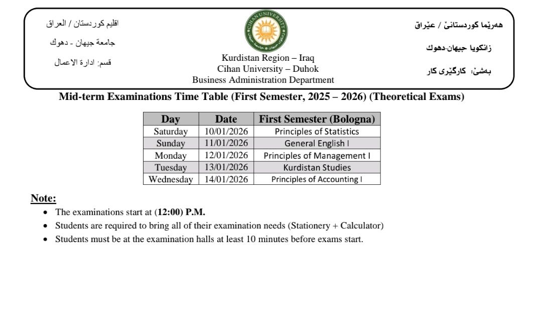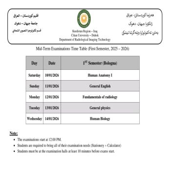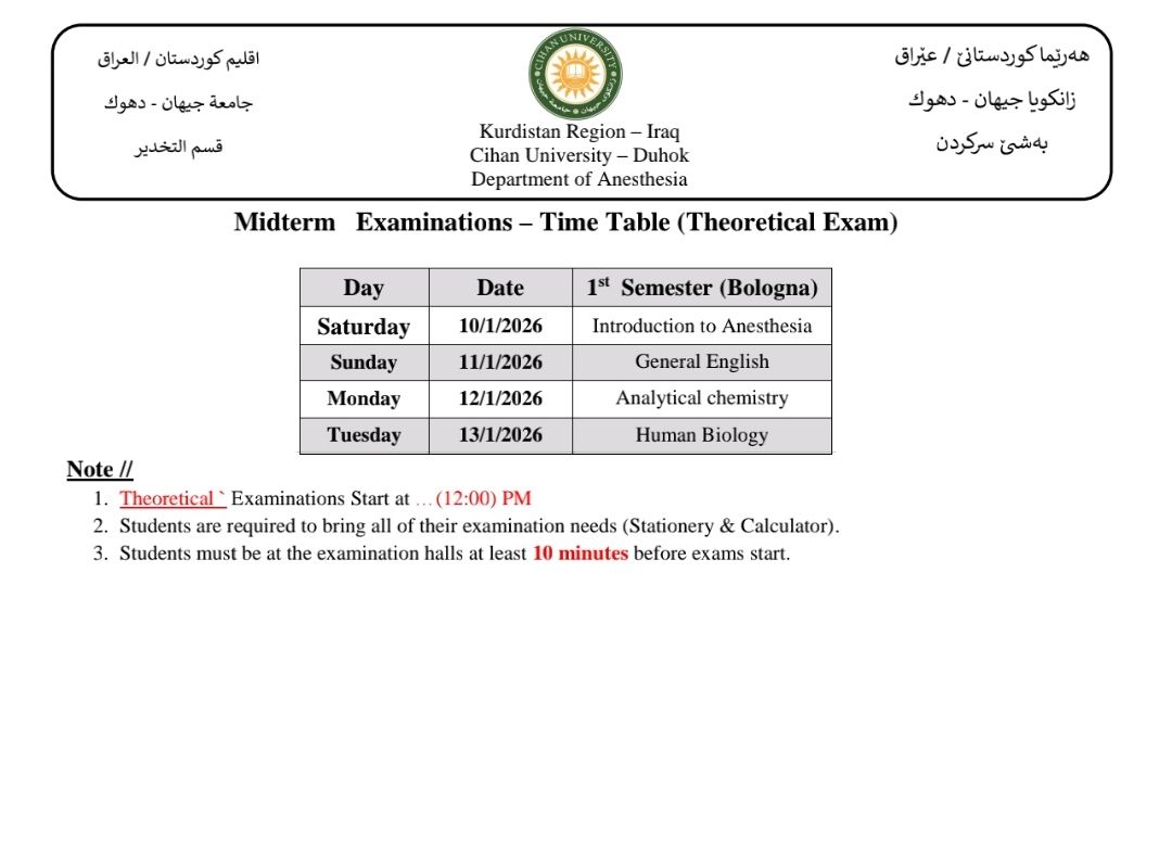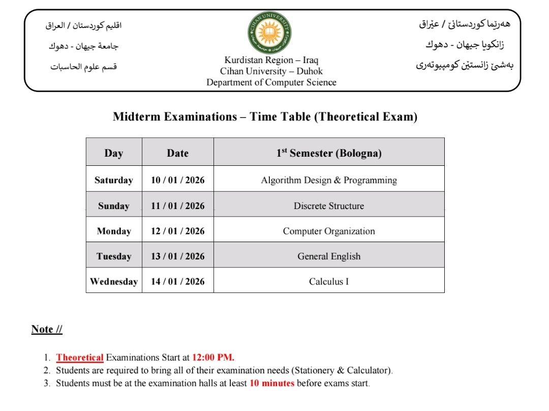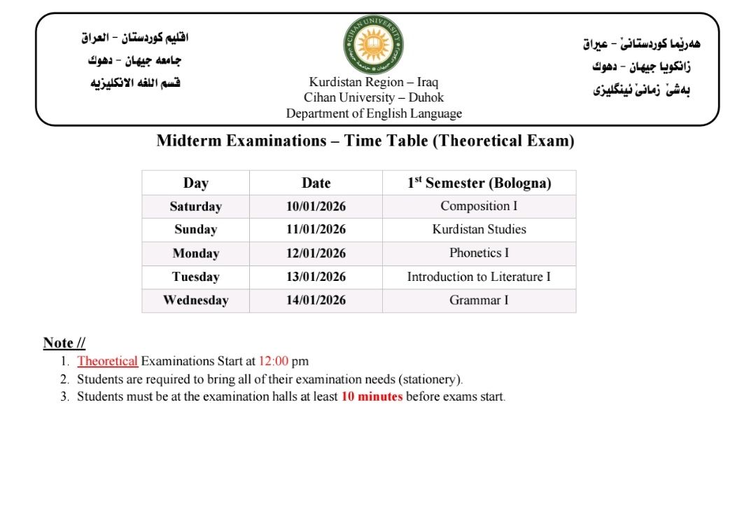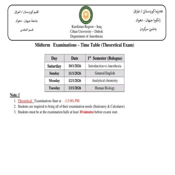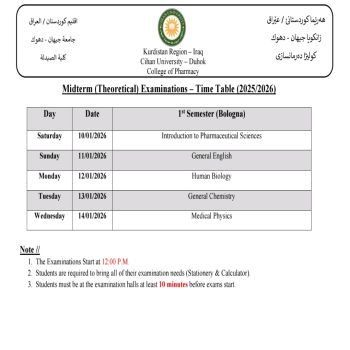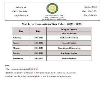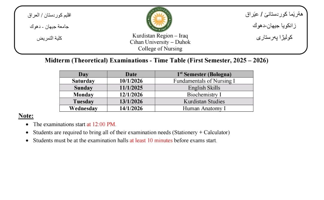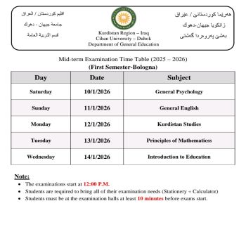 خشتێ تاقیکرنێن نيڤا سمستەرێ ئێکێ (سیستەمێ پولونی) یێن تیوری (نظري) بو هەمی پشکێن زانستی یێن سەر ب زانکویێ ڤە بو سالا خواندنێ (2025 - 2026) کو دێ هێنە ئەنجام دان ل روژا شەمبی رێکەفتی (10/01/2026) ل دەمژمێر 12:00 نیڤرو.
